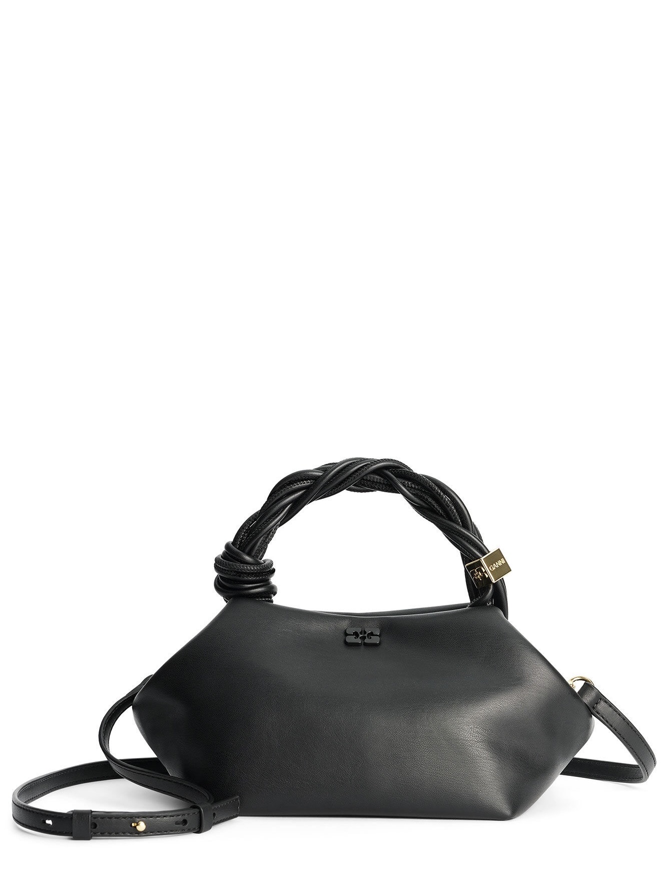 Denne Black Small GANNI Bou Bag har en tone-i-tone metallisk GANNI Butterfly-logo, et vridd håndtak med en flettet knute og en gullfarget metallisk terning med en inngravert GANNI Butterfly-logo. Vesken har en intern magnetisk lukking, en flat kortlomme inni og en justerbar og avtakbar skulderrem for bæring over kroppen.