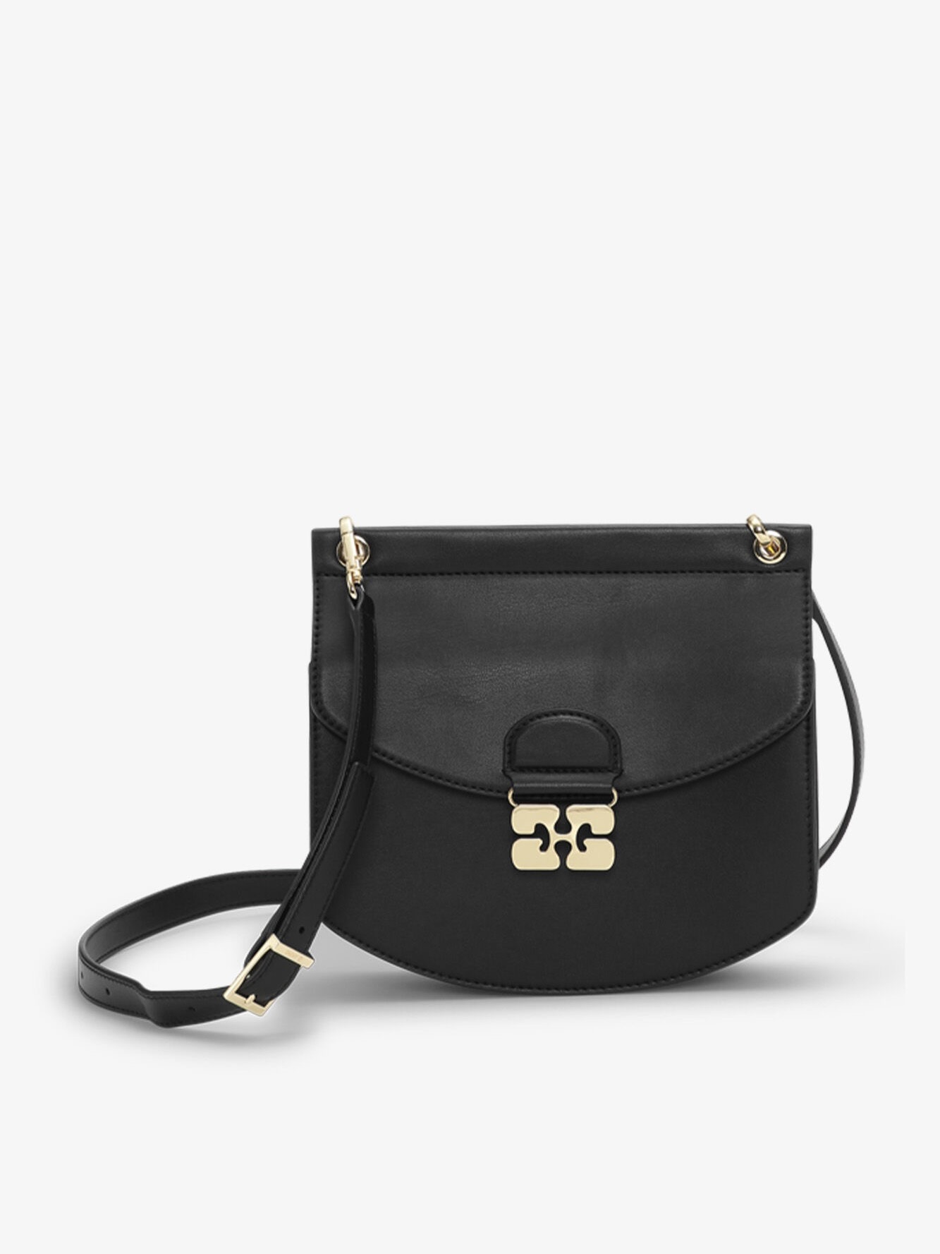 Black Small Apo-G-vesken er svart og har en blank overflate. Apo-G-vesken er laget av recycled leather og har magnetisk lukking med en gullfarget GANNI «Butterfly»-lås og en avtakbar stropp, slik at den kan brukes både som skulderveske eller clutch. Den kompakte innsiden har en stikklomme og tre hovedrom, hvorav ett med glidelåslukking.
