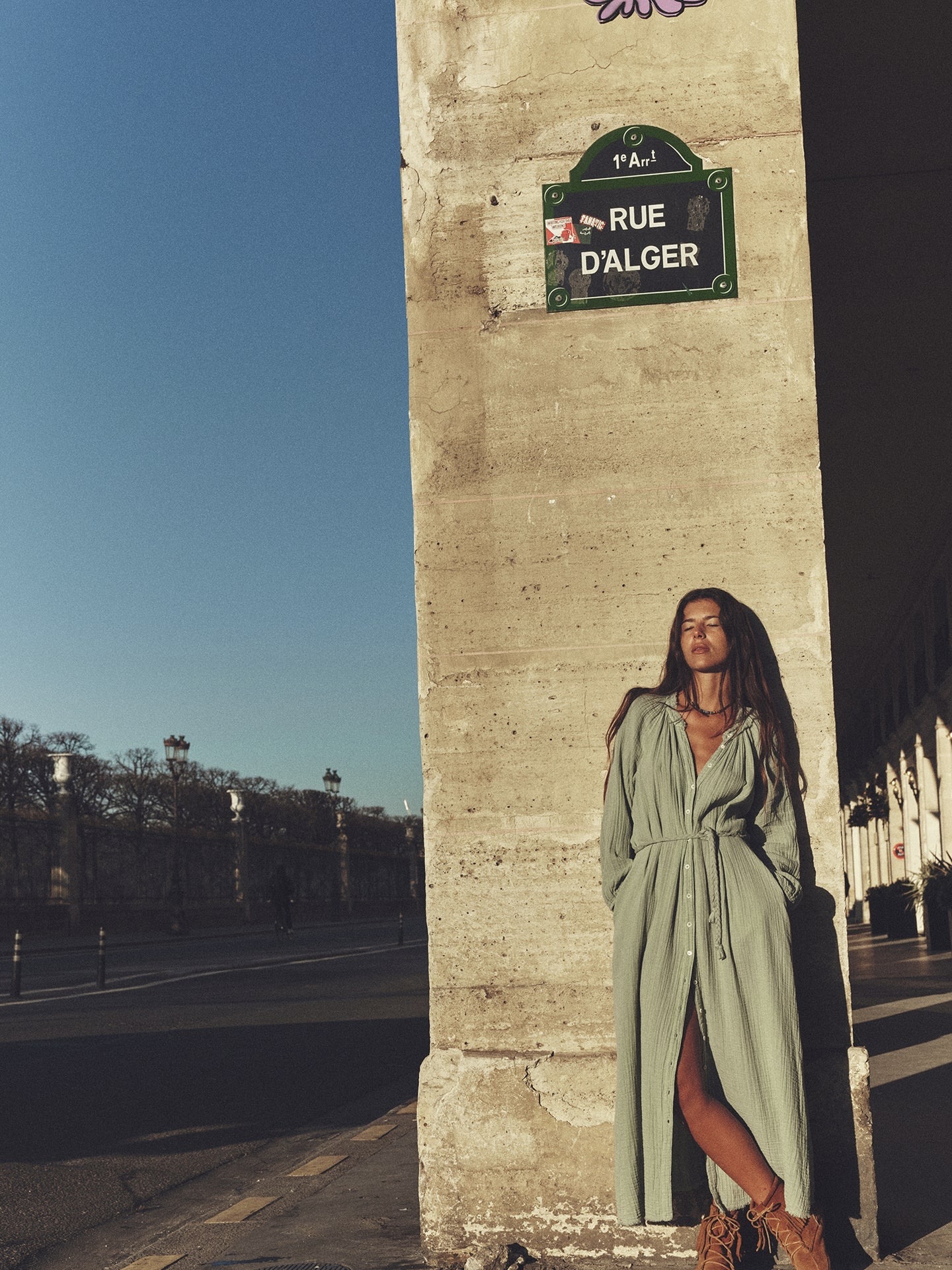 Andrea er ny denne sesongen i Xirena sin vaskede doble bomullsgasbind for en myk, lett krøllet følelse. Andrea er en midikjole foran med knapper med rå kant i halsen, raglan-ermer, rynker i hele, sidesømlommer, flettet selvbelte og rå kant.