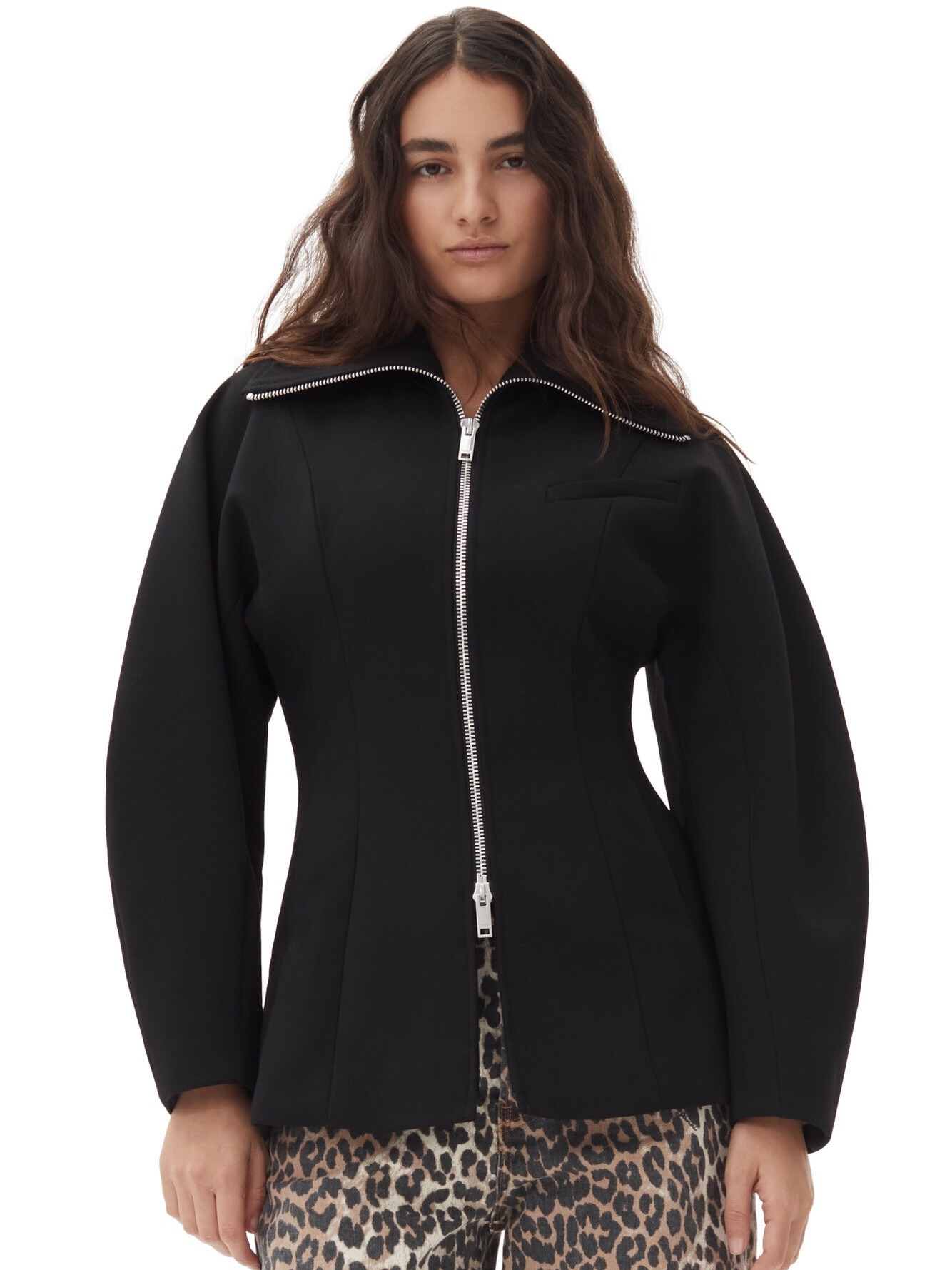 Denne Black Bonded Crepe Curve Sleeve-jakken har en hel glidelåslukking med sølvglidelås, en høy krage som kan bæres opp eller brettes ned, og en åpen brystlomme.