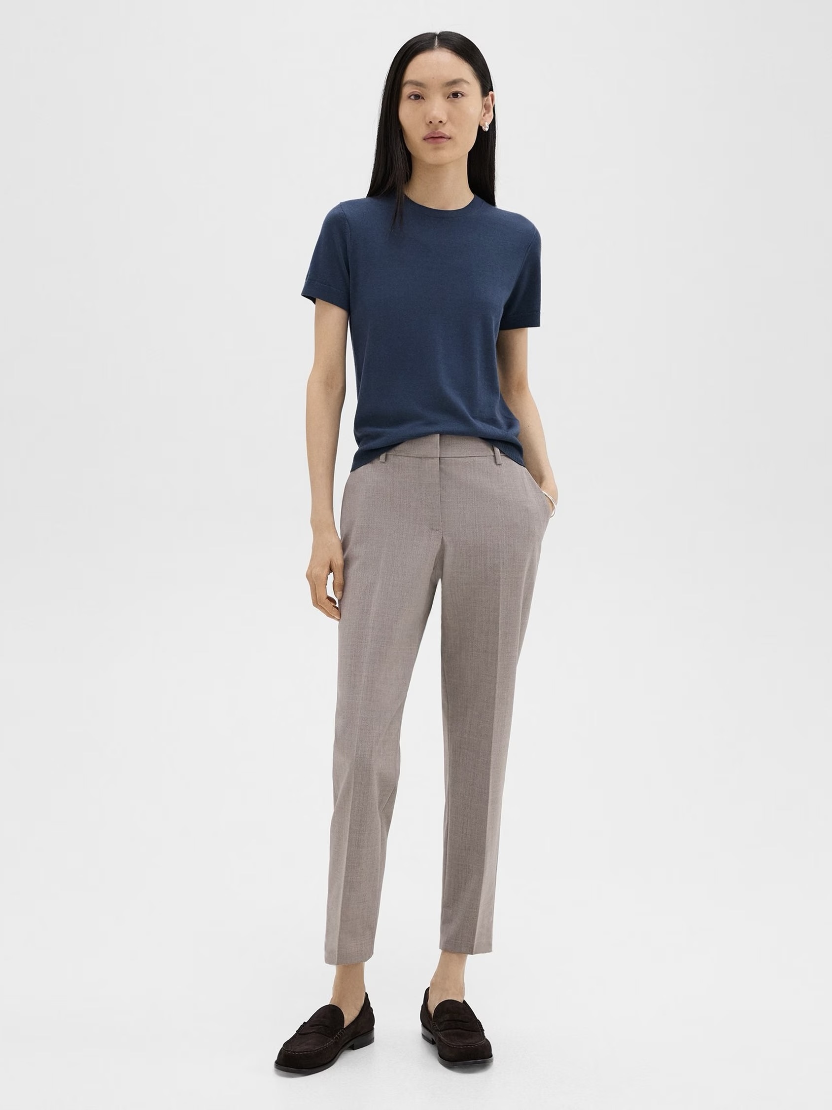Denne avkortede buksen er en utpreget favoritt fra Theory. Skreddersydd i Theory sin bestselgende Treeca-passform, som flater benet med en slank og rett profil. Den er detaljert med hekte-og-glidelåslukking, sidelommer og passpolerte lommer bak.