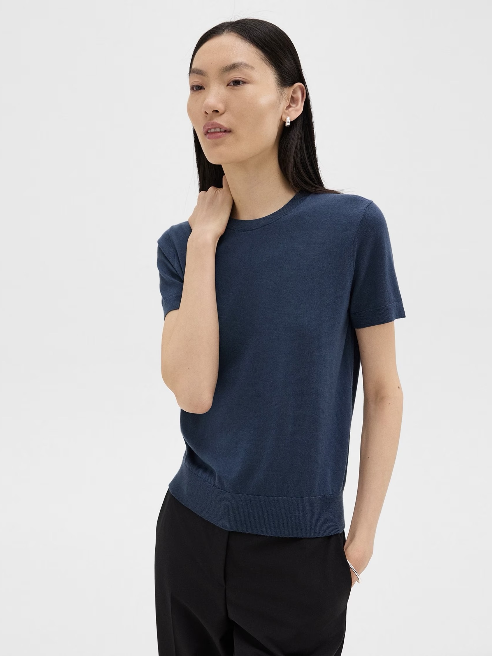 Denne kortermede t-skjorten har rund hals og klassisk ribbestrikk. Denne genseren er perfekt for lett lag på lag, og er spunnet av luksuriøs fin-gauge merinoull fra en av Italias fineste fabrikker. Designet for å være grunnlaget for garderoben din.