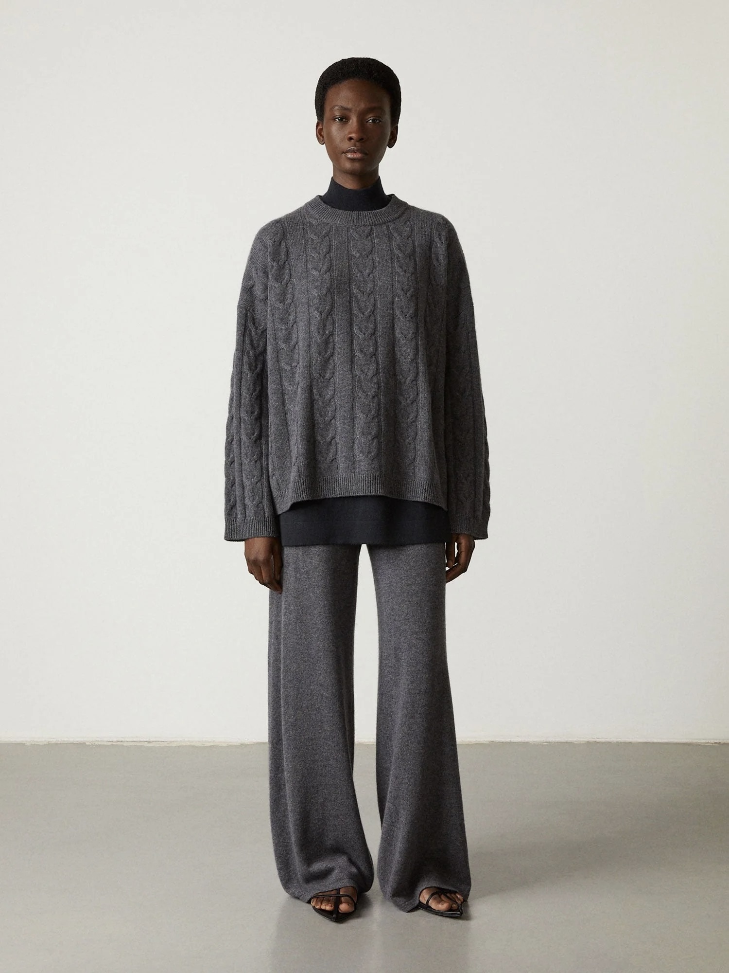 Vilma-genseren fra Lisa Yang har panelkabling og er designet for en silhuett som ikke passer litt, med rund hals og rette ermer. En slank ribbestrikk og lett senkede skuldre rammer den inn.
