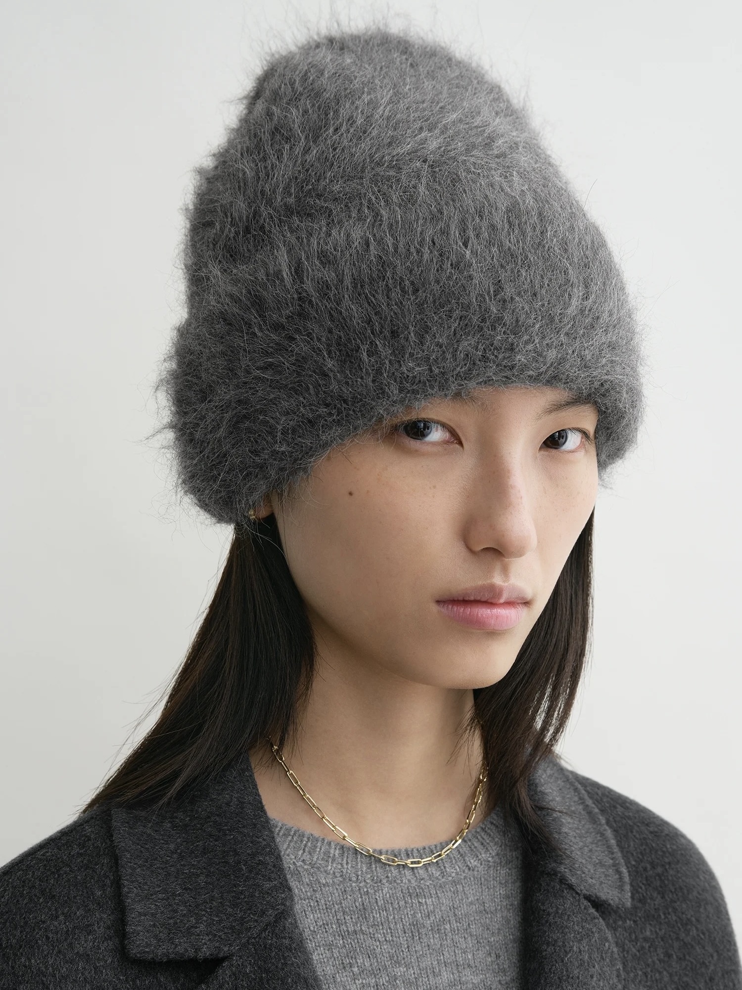 TOTEME lue forestilt som et varmt vintersett komplett med Boxy alpakkastrikk. Den er strikket av en uklar alpakkablanding med melert effekt og kan brukes med kanten foldet eller forlenget.