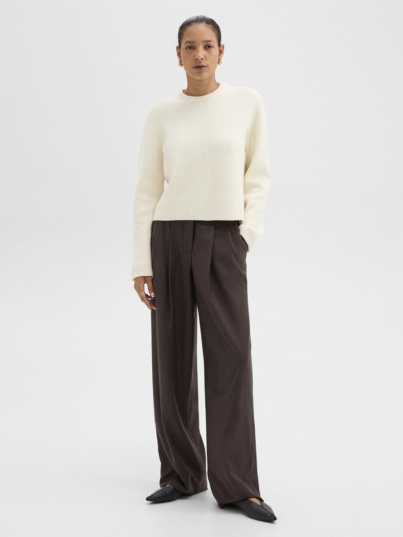 Denne brede buksen er designet med strategisk plasserte folder som fremhever den høye midjen. Glidelås langs en knappgylf foran, den er laget av fin italiensk ullflanell som er myk, lett og har et sofistikert utseende.
