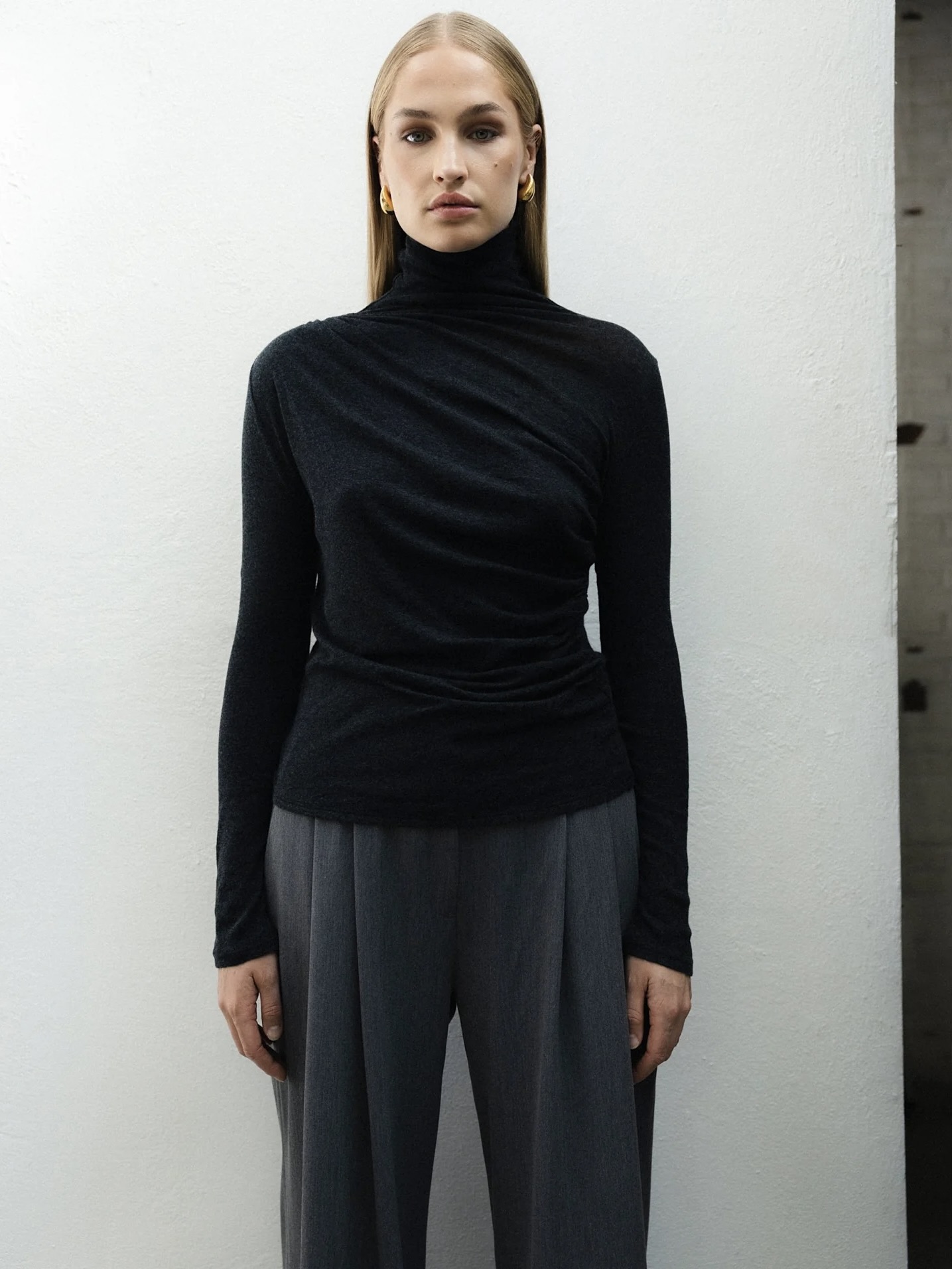 VIVEH Fir-toppen har en silhuett med smal passform med lange ermer, turtleneck og kryssede rynker på skulderen og sidesømmen for en elegant, sofistikert look. Laget av superfin, delikat bomull, er gran myk mot huden og delvis gjennomsiktig.