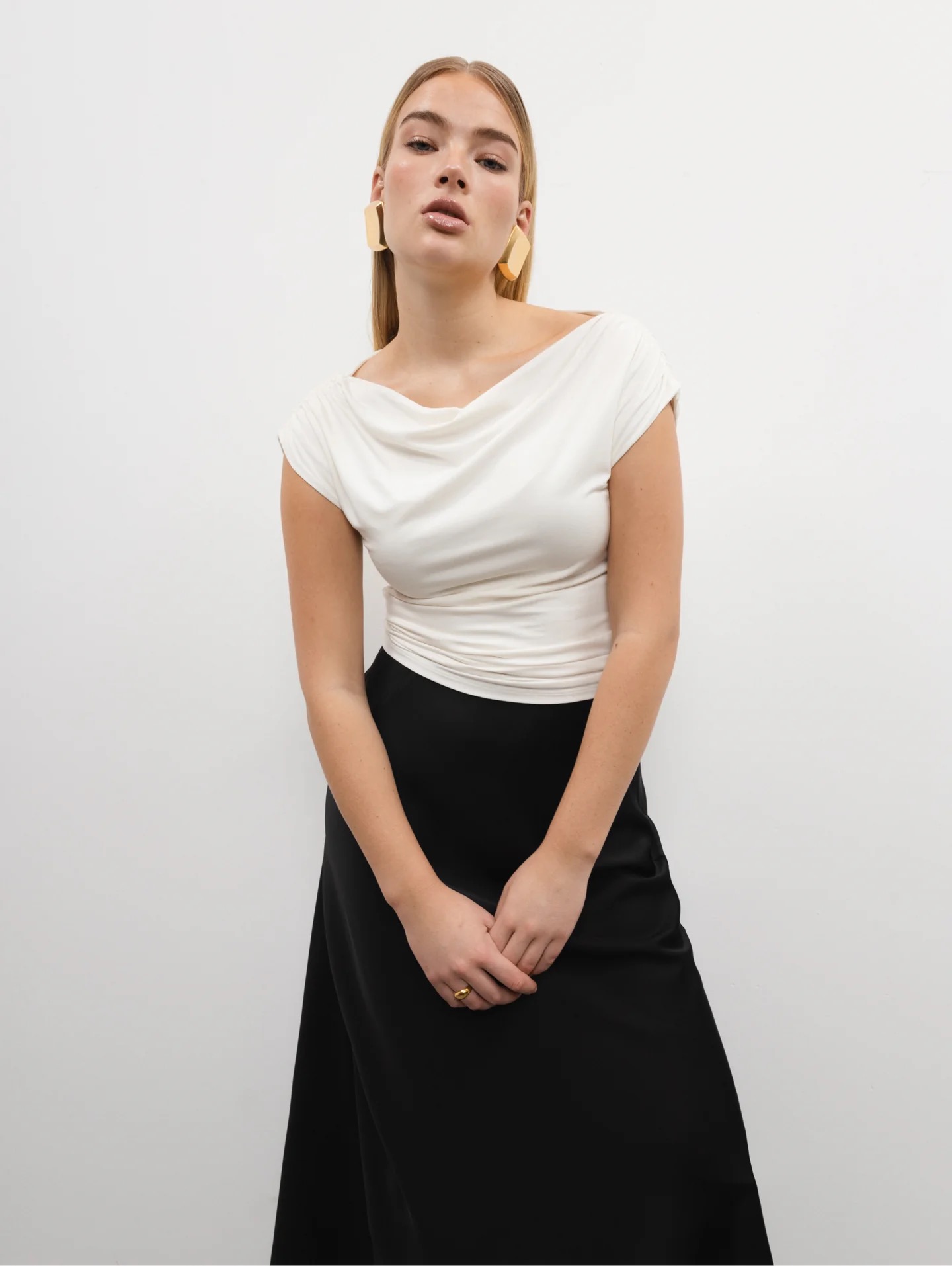 VIVEH Ruta-toppen har en avslappet passform rundt skuldrene og en bred, hengende utringning, som resulterer i en elegant drapering over brystet. Kan brukes på begge eller en skulder. Den nedre delen av toppen har en tilpasset følelse og er dobbeltfôret for ekstra støtte.