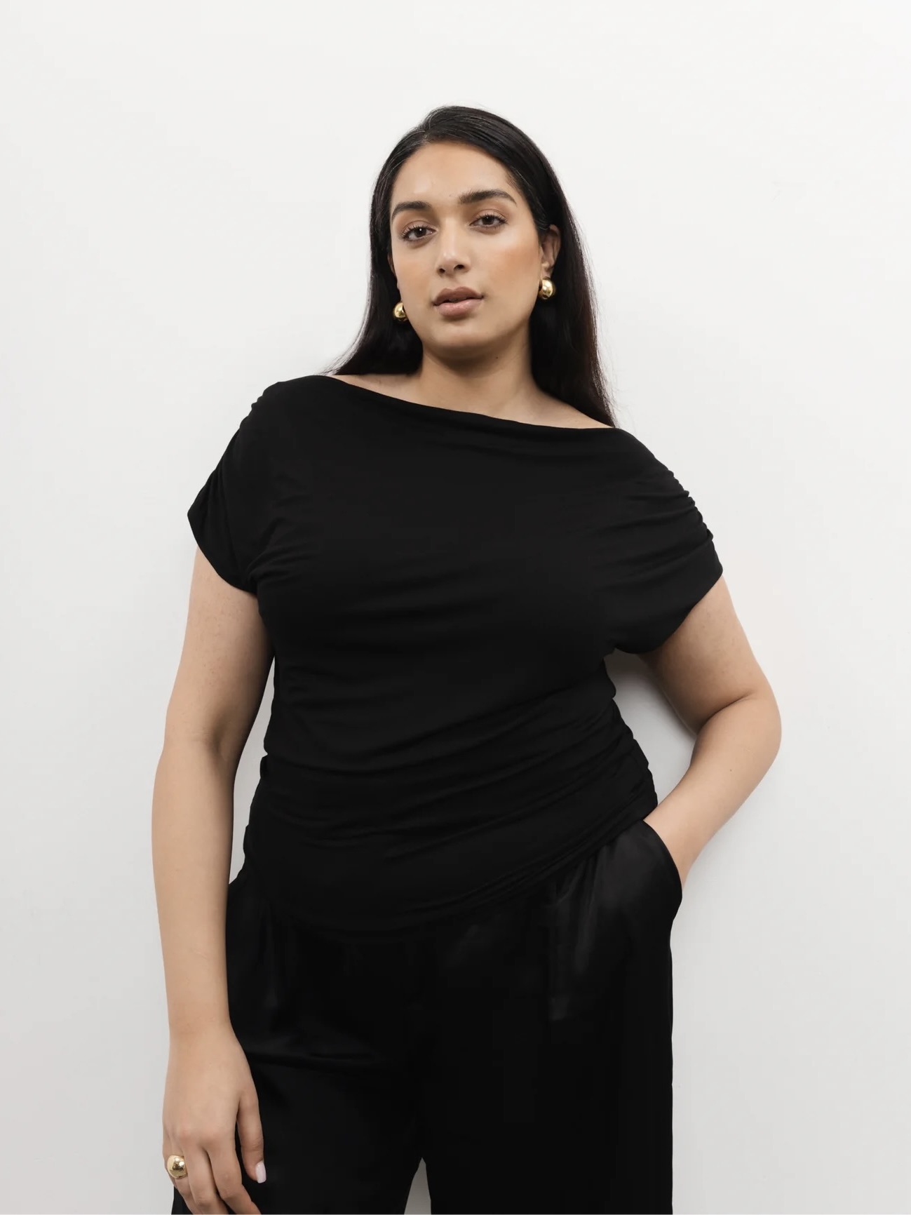 VIVEH Ruta-toppen har en avslappet passform rundt skuldrene og en bred, hengende utringning, som resulterer i en elegant drapering over brystet. Kan brukes på begge eller en skulder. Den nedre delen av toppen har en tilpasset følelse og er dobbeltfôret for ekstra støtte.