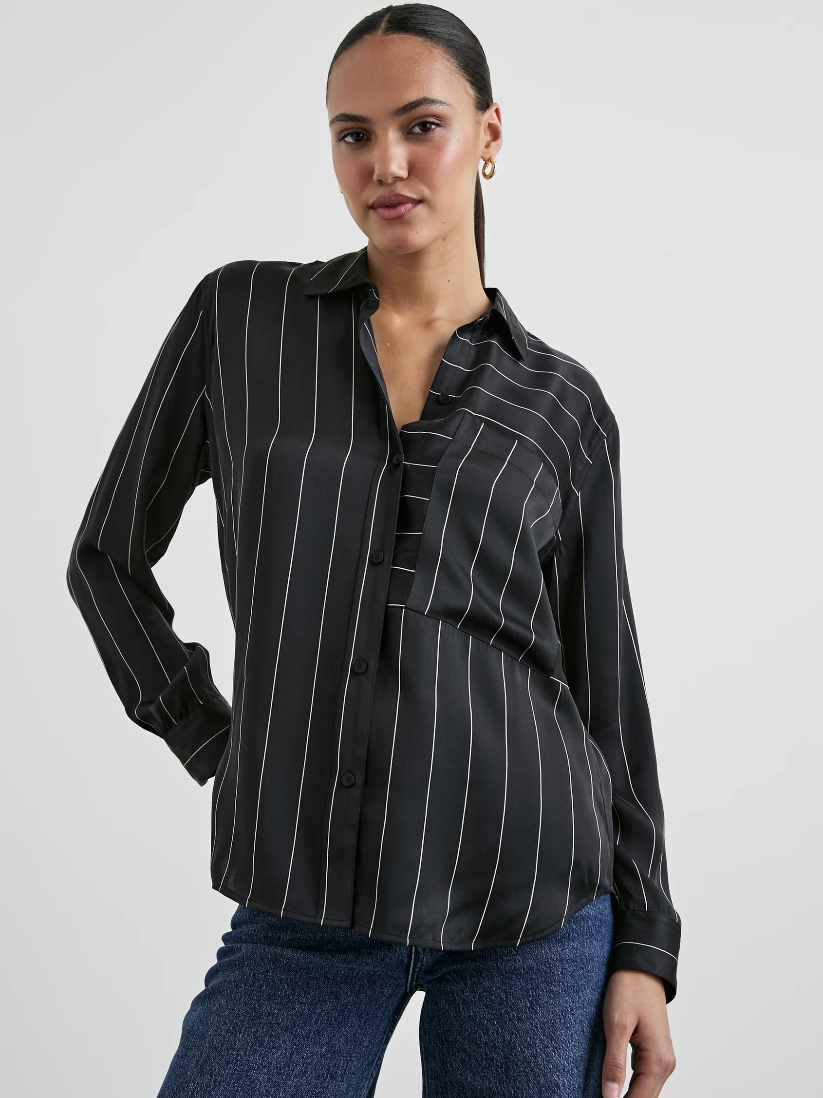 Spencer-skjorten er her for å foredle samlingen av skapstifter. Laget av superglatt silke charmeuse, løfter Spencer den klassiske button-down med vertikale striper, en kontrasterende, overdimensjonert lapplomme på brystet og en litt lengre lengde. Bruk sesong etter sesong, året rundt, Spencer går aldri av moten.