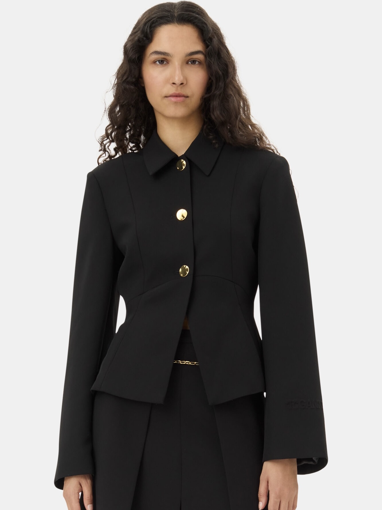 Black Light Twill Suiting-blazeren har en klassisk, spiss krage og tre gullfargede knapper foran. Blazeren har lange ermer og en diskret plissé i midjen.