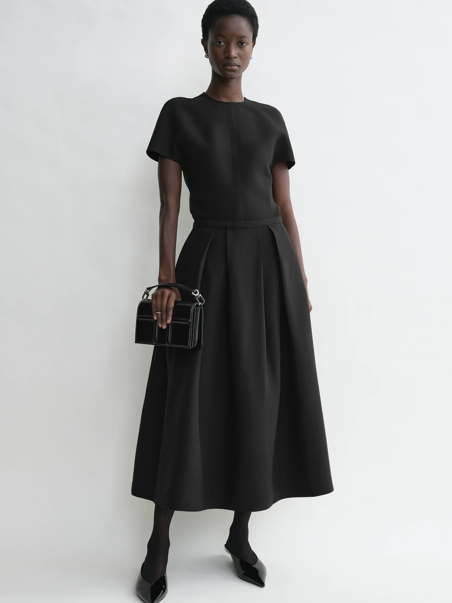 TOTEME-skjørt konstruert med omhyggelig plissering for å etterligne formen til en tvillingblomst. Den er laget av en strukturert blanding av ull- og silkefibre og festes med en skjult sideglidelås. Bruk den med en bluse og pumps til middag.