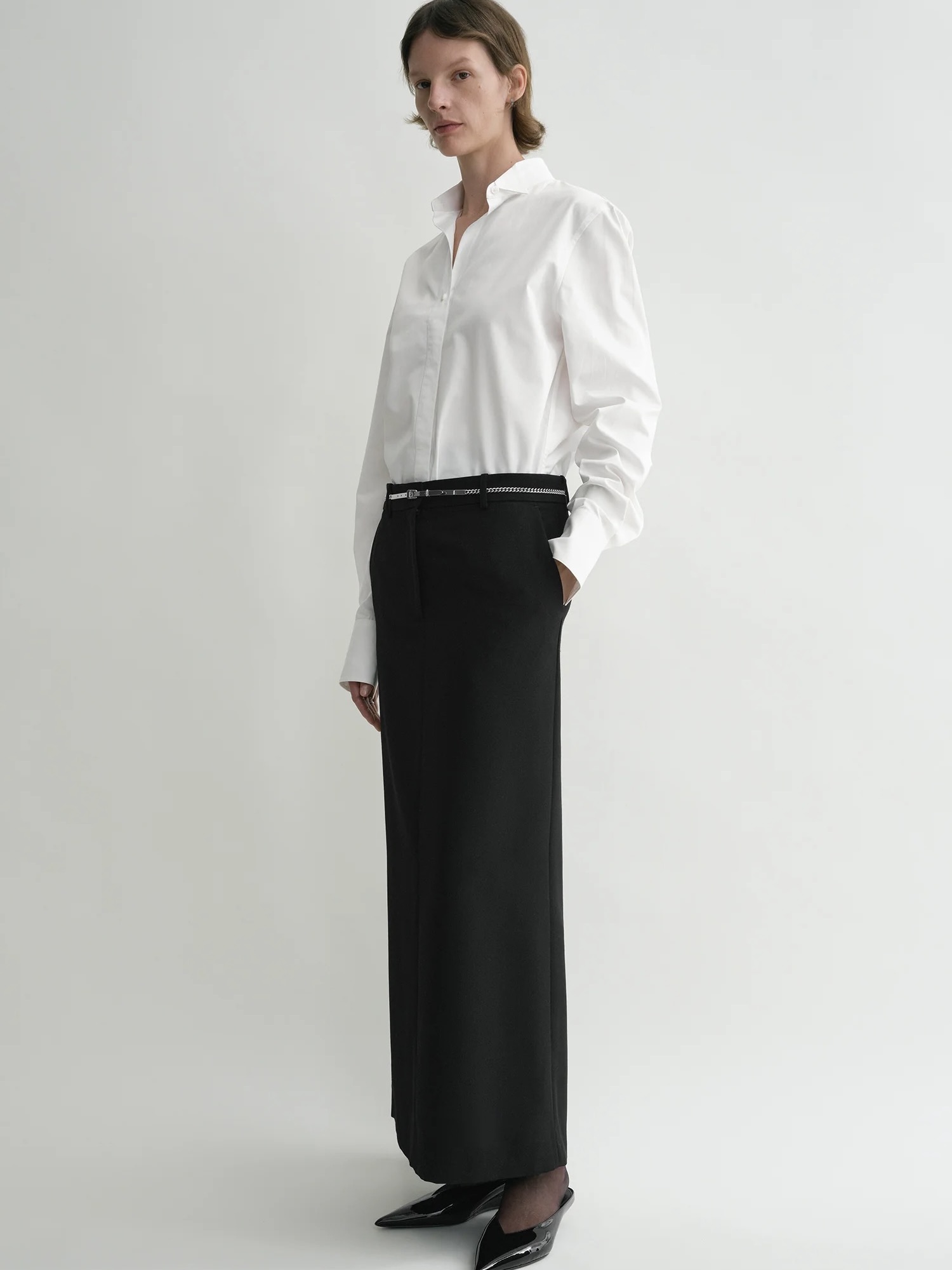 TOTEME smokingskjorte inspirert av kolleksjonens kveldsdressing-tema. Den er laget av rik organisk bomullspoplin med en tett, men lett håndfølelse, og har en tradisjonell foldekrage, en skjult knappestolpe og en buet kantlinje med trappet snitt. Kombiner den med et skjørt som en del av en anledningslook.