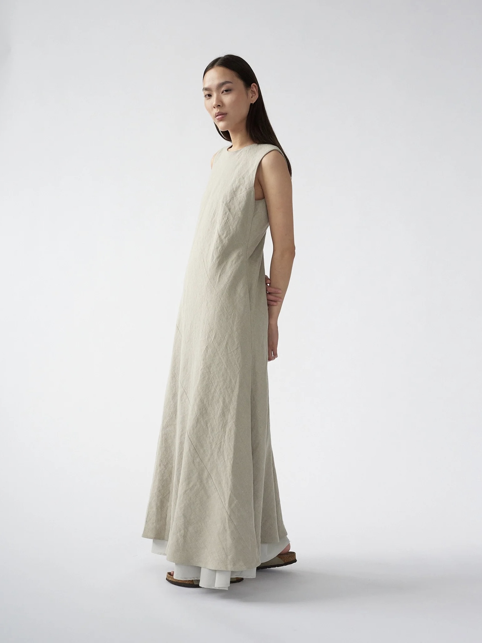 Armløs maxi-kjole laget i tungt lin. Kjolen har slukning med glidelås, sidelommer og draperdetaljer bak. Innerdelen er synlig på nederste del av kjolen.