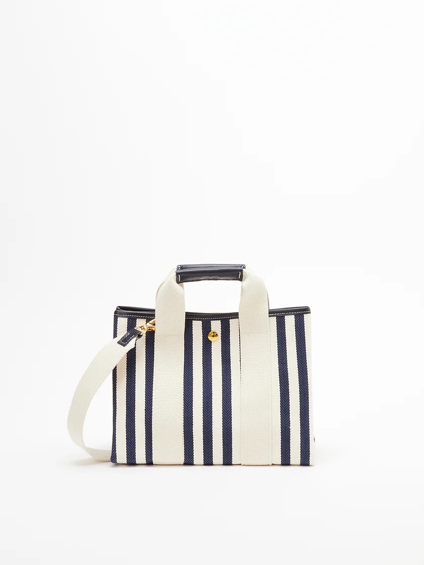 Den lille "Traversée"-vesken, laget av bomullsstoff, har marine og hvite vertikale striper, en hvit taustropp og to innerlommer.