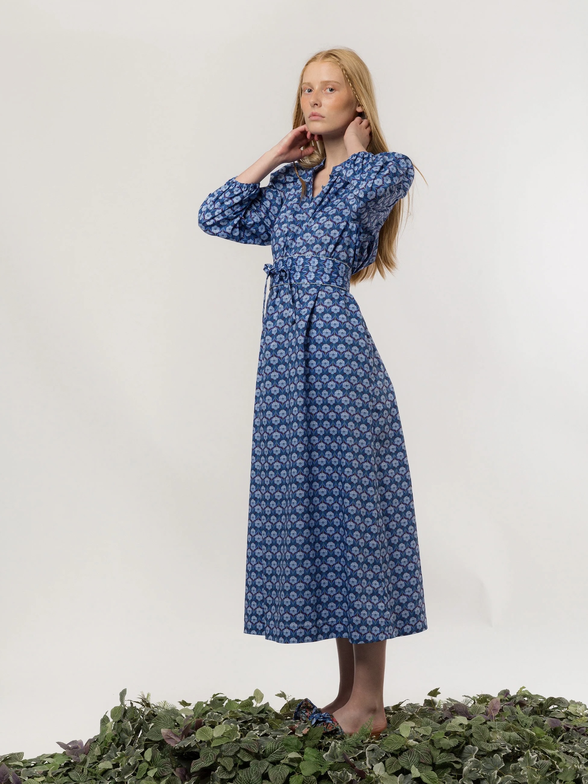 Stilig og elegant maxikjole i klassisk chevron-blomstermønster, med puffede 3/4-ermer, skjulte lommer og justerbar linning. Laget av 100 % OEKO-TEX Liberty bomull for en myk og lett følelse. Diskrete pipingdetaljer og en flatterende silhuett fullfører designet.