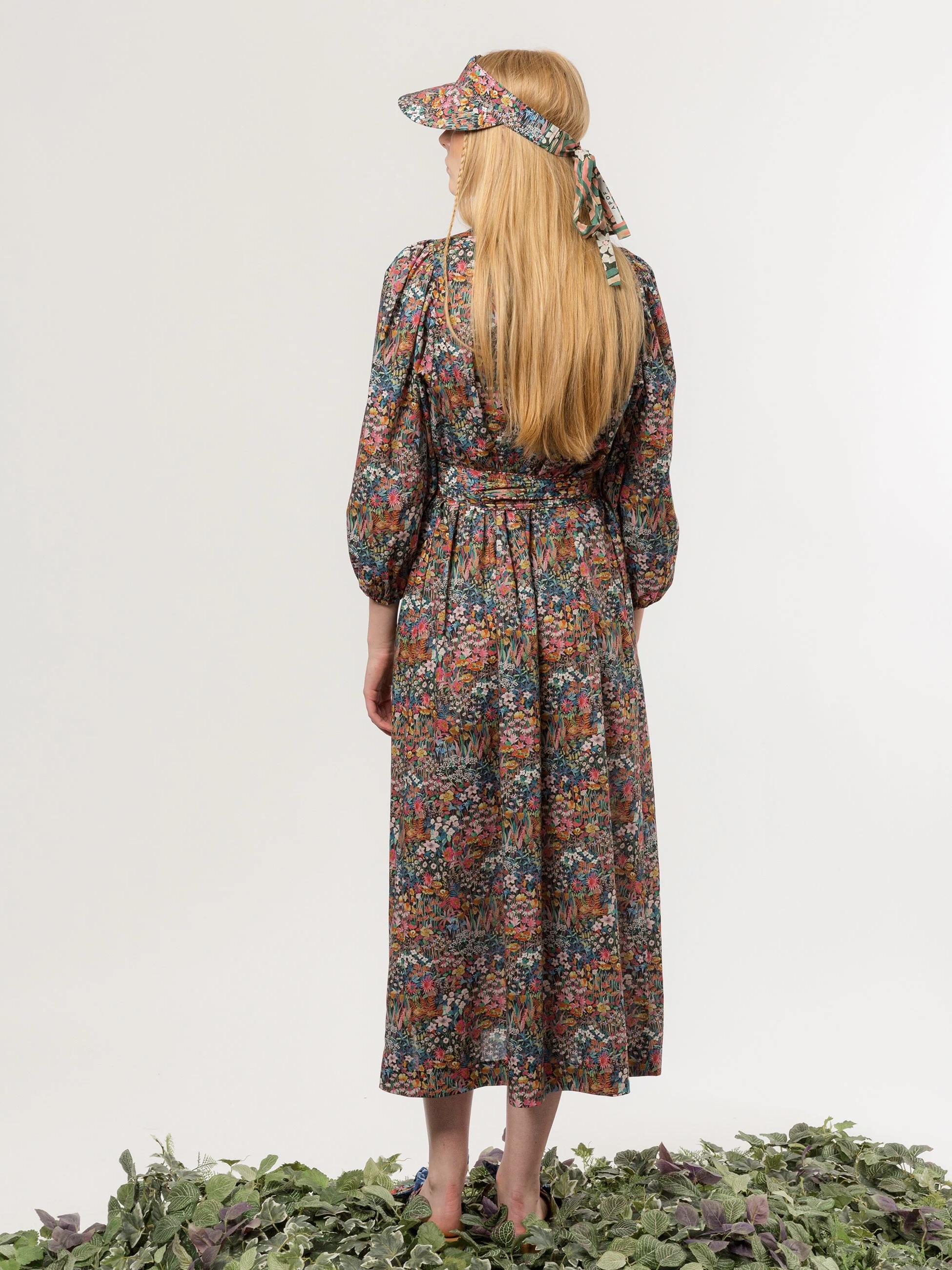 Stilig og elegant maxikjole i klassisk chevron-blomstermønster, med puffede 3/4-ermer, skjulte lommer og justerbar linning. Laget av 100 % OEKO-TEX Liberty bomull for en myk og lett følelse. Diskrete pipingdetaljer og en flatterende silhuett fullfører designet.