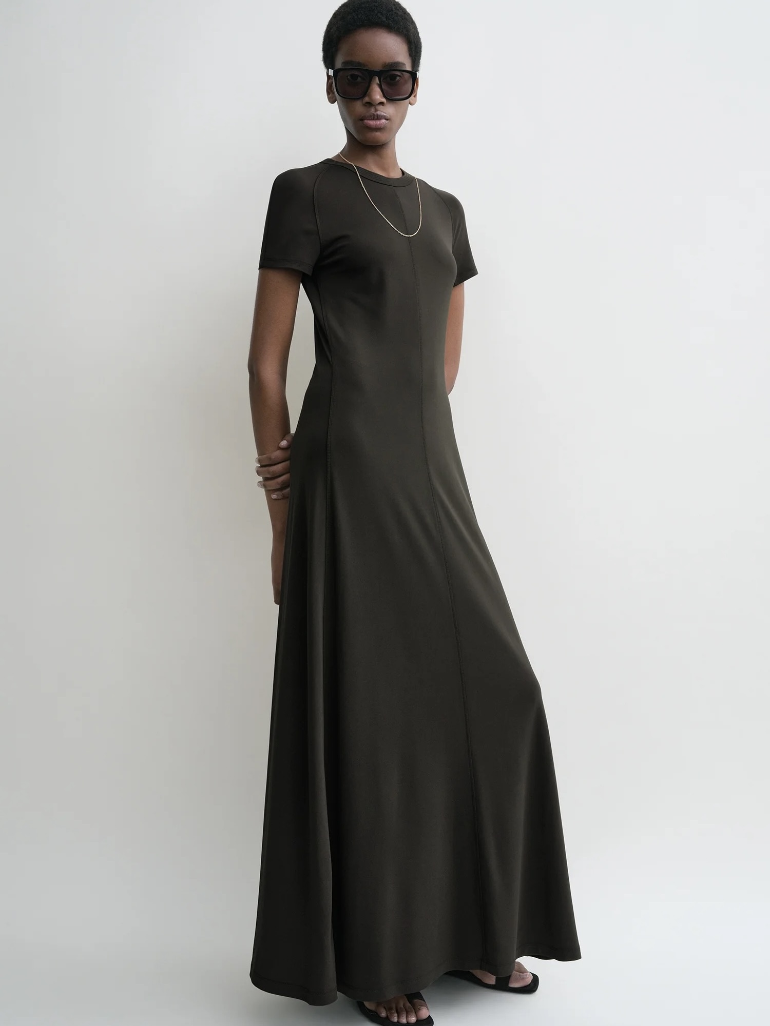 Lang TOTEME-kjole med korte raglan-ermer og sidesømmer som svir frem for en sporty følelse. Den er strikket av flytende mellomvektsjersey med tørr hånd og festes med en skjult glidelås bak. Bruk den for å spise brunsj i helgen.
