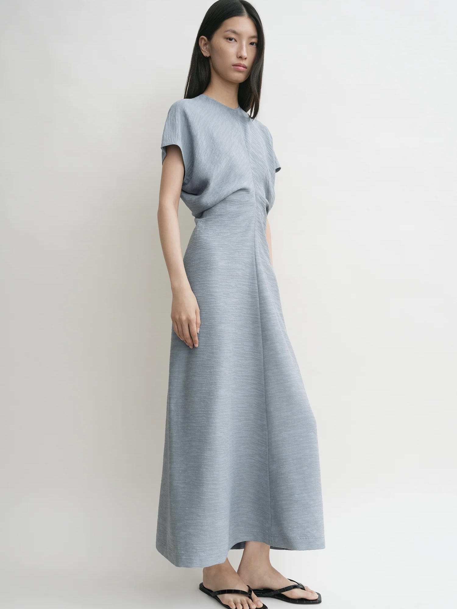 TOTEME-kjole laget av buede paneler som skaper en nedslående effekt i midjen når den sys sammen. Den er laget av en krøllet viskoseblanding med hettermer og ankelkant og lukkes med en skjult glidelås bak. Kombiner den med hæler eller flater for å delta på en hagefest.