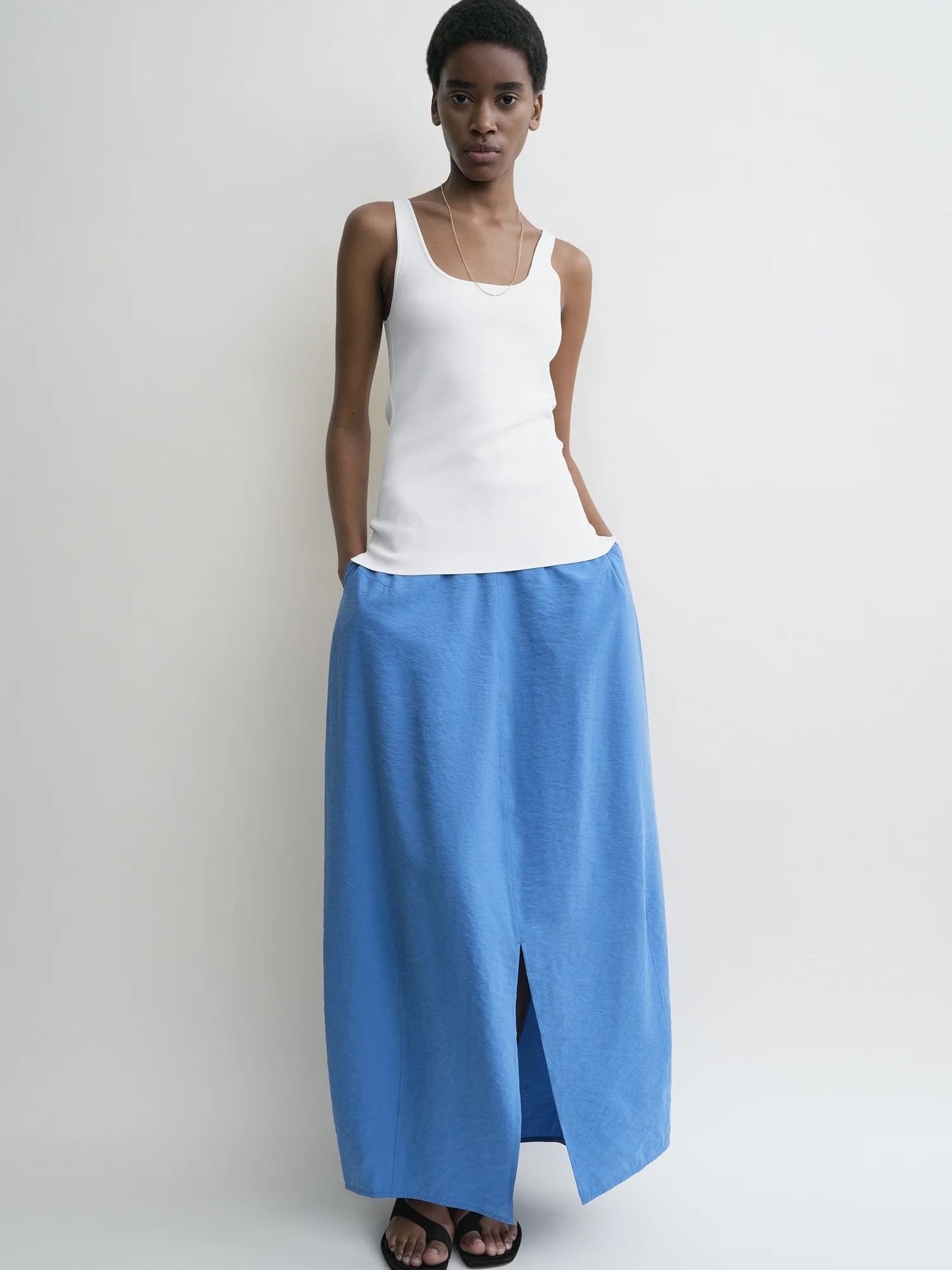 TOTEME-skjørt i fallskjermstil laget av en luftig og myk teksturert silkeblanding. Den har en lang og rikelig eggform med sidelommer og skjult glidelås bak. Forskyv den voluminøse silhuetten med en slank topp.