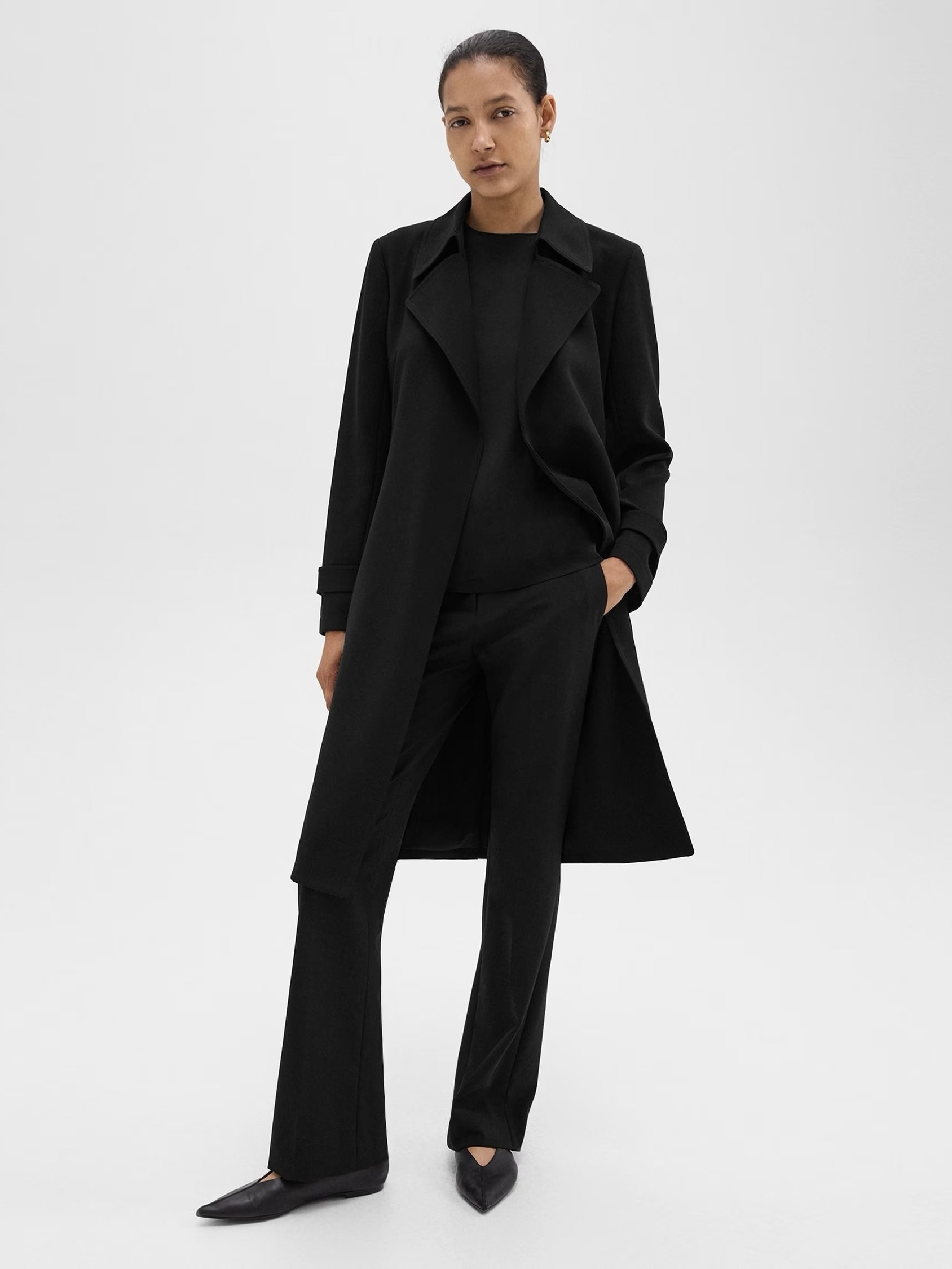 Theory sin minimalistiske trenchcoat er et tidløst yttertøy som umiddelbart foredler ethvert utseende. Ferdig med et knyte i midjen for å dempe den avslappede silhuetten, er denne helfôrede stilen kuttet fra vår signatur japanske Admiral Crepe for en mykt drapert passform som opprettholder et polert utseende.