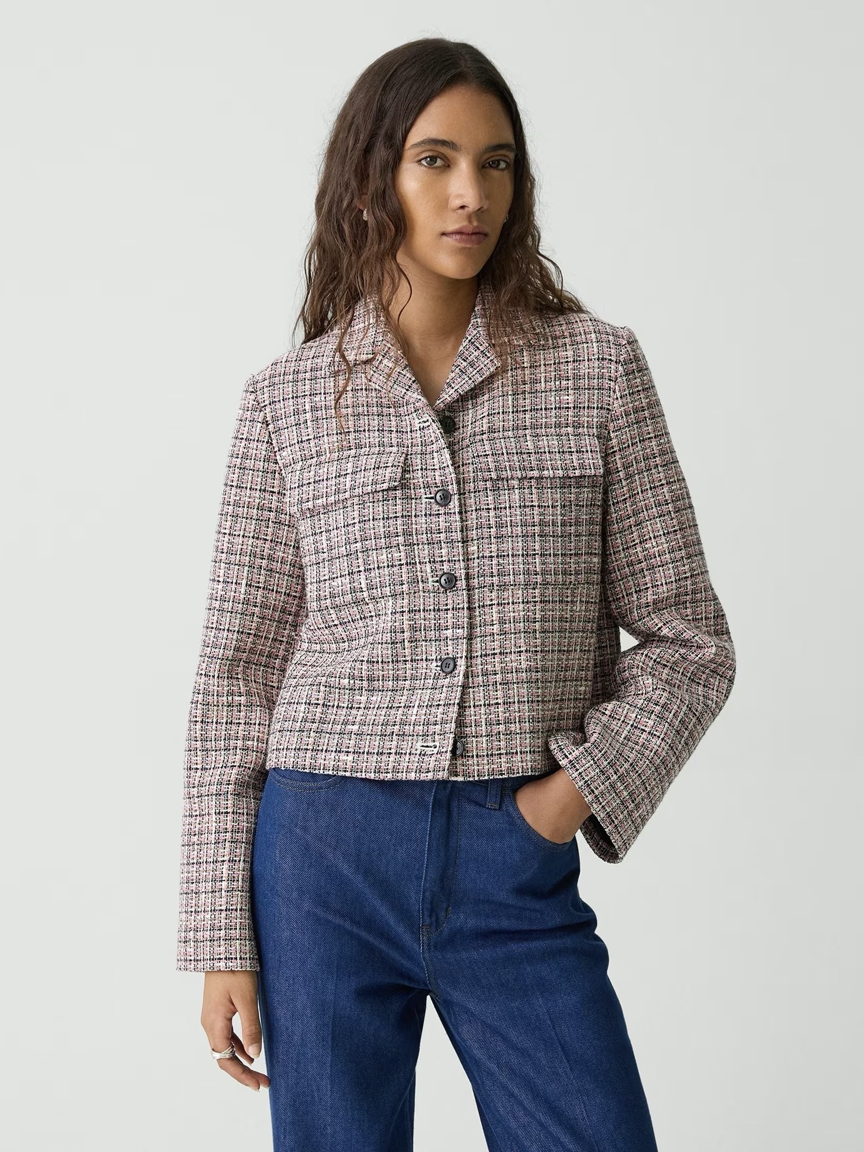 En klassisk, avkortet jakke med en avslappet silhuett, denne knappe-fronten er detaljert med hakkede jakkeslag og et par brystlommer. Produsert i Italia fra en ledende tweedleverandør, gir fiberinnholdet i bomullsblandingen og stoffvekten komfort og pusteevne gjennom bruk av subtil glans og tvunnet garn.