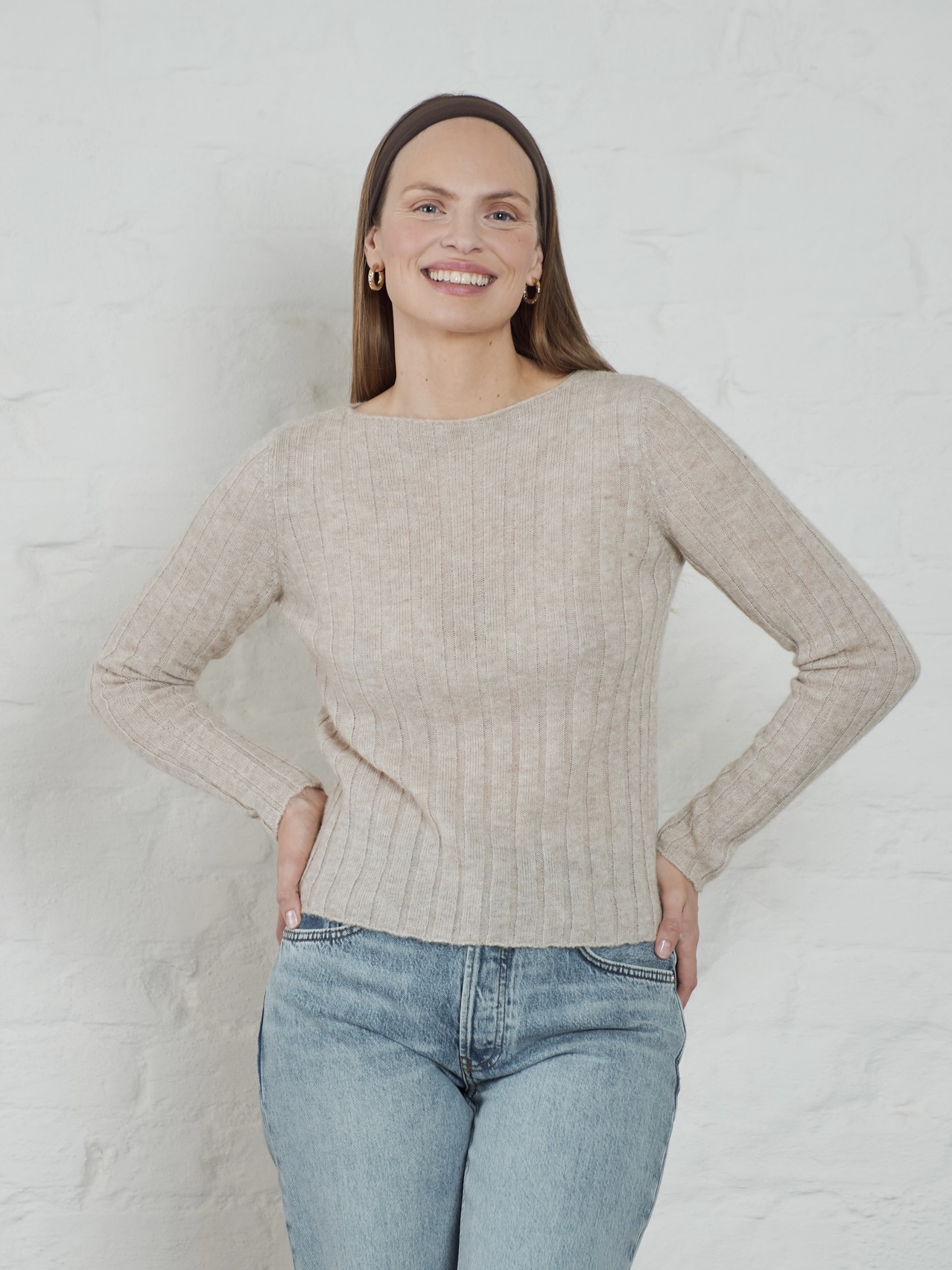 Tynn, tettsittende genser med bredt ribbestrikket mønster. Lett gjennomsiktig for et delikat utseende. Modellen har båthals og er kort i lengden, perfekt for å skape et elegant og moderne uttrykk.