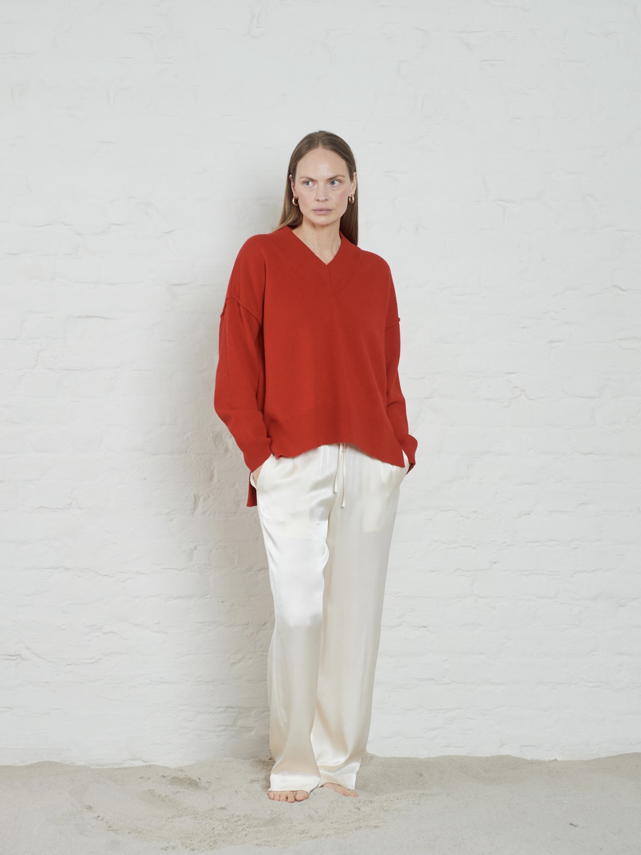 Tidløs strikkegenser laget i en myk og tett ullblanding. Genseren har en stilren V-hals, dekorative vrangsømmer, avslappede skuldre og små splitter i sidene. Baksiden er litt lengre enn forsiden for en moderne silhuett. Ribbestrikkede detaljer på kanten, ermene og halsen fullfører det stilrene uttrykket, mens den rette og romslige passformen gir et komfortabelt preg.