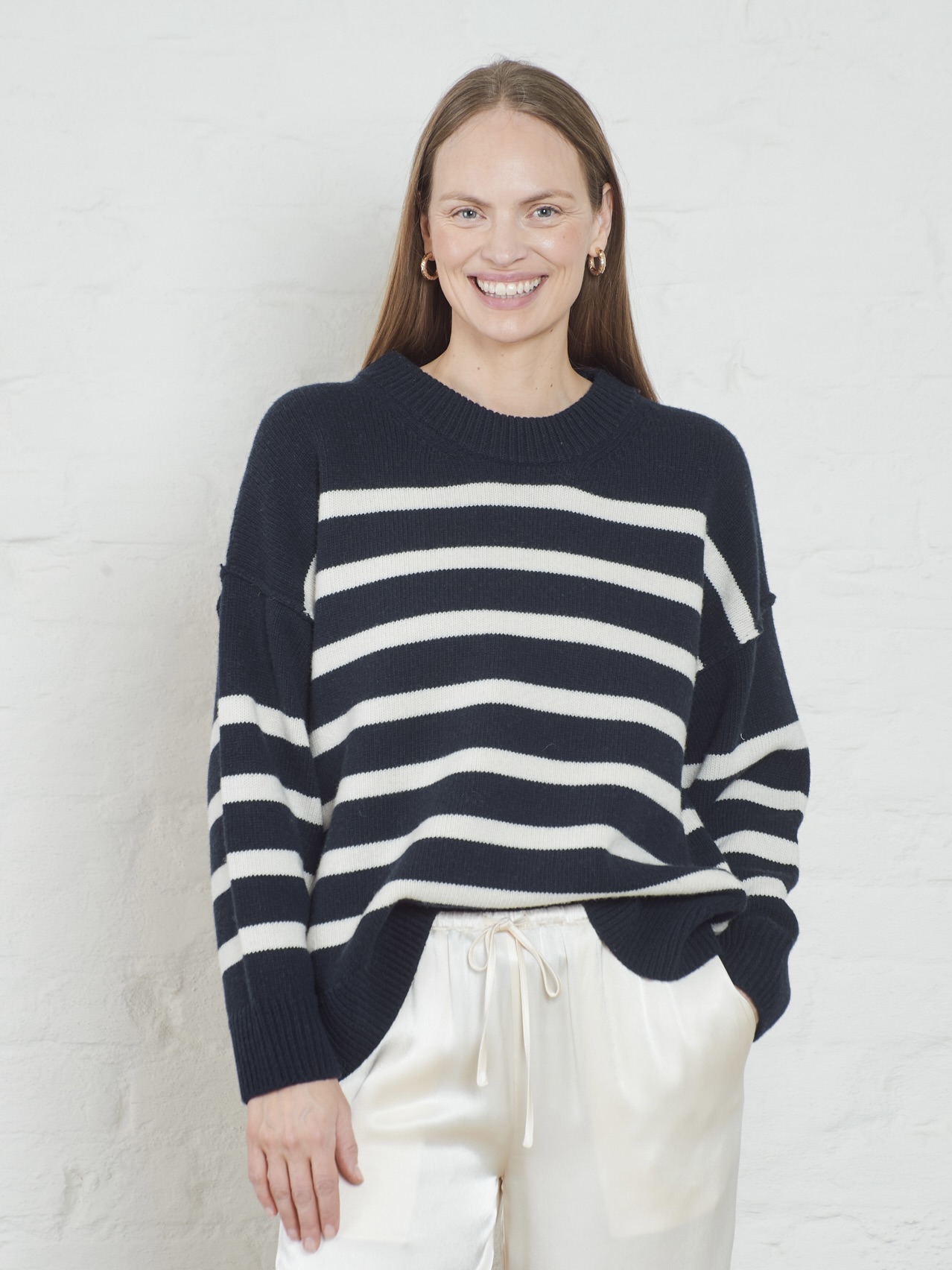 Chunky stripete strikkegenser i en kompakt og myk ullblanding. Modellen er designet med rund hals, vrangsømmer, nedfalne skuldre. Ribbestrikket hem, mansjetter og hals. Rett og romslig i fasongen med noe smalere ermer.