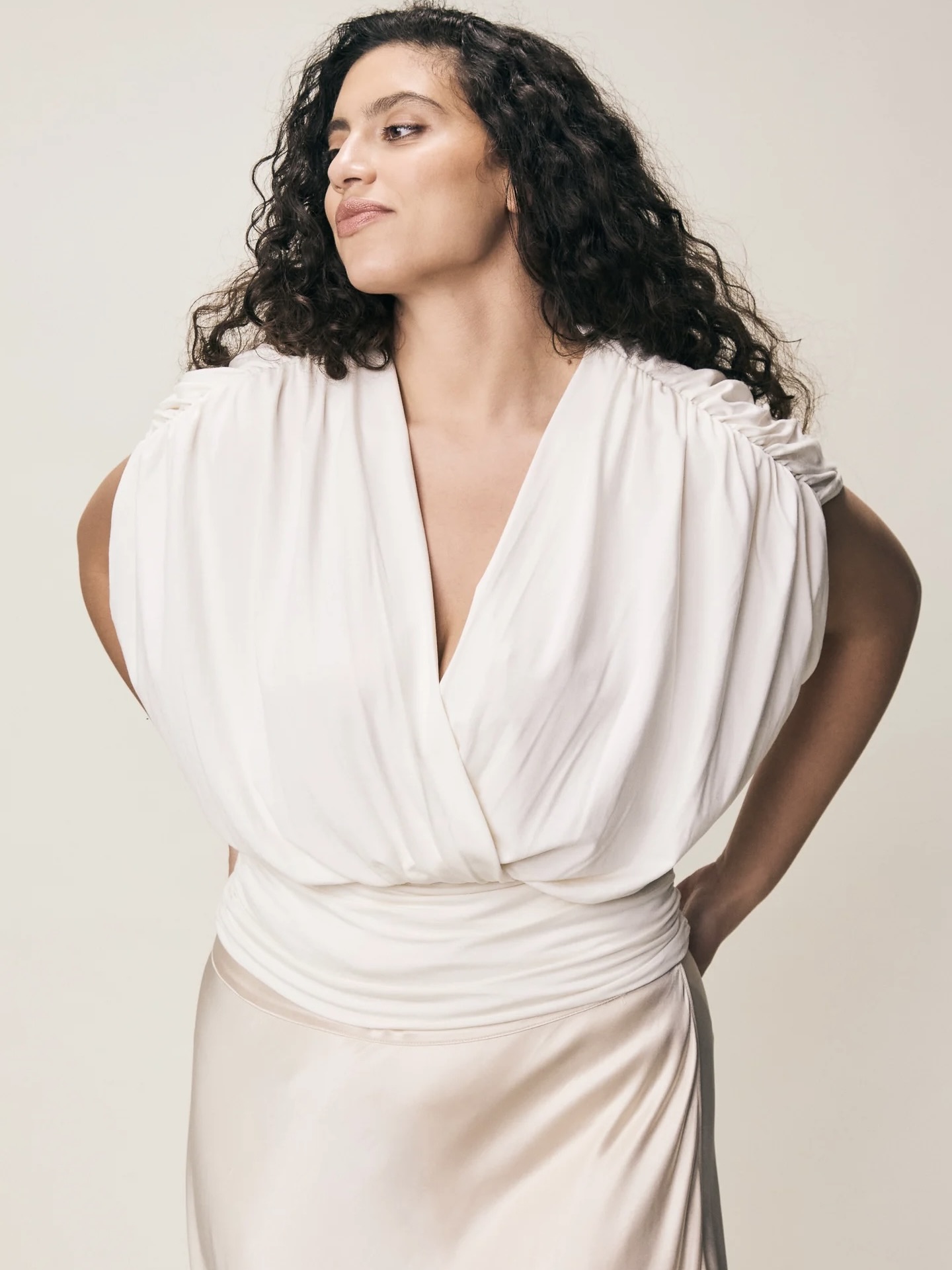VIVEH Conus er laget med VIVEH-signaturstoffet, en ECOVERO™ viskosejersey som draperer vakkert og sitter tett rundt kroppen. Designet har en løs passform ved skuldrene og en tettsittende midje. Skuldersømmene draperes over skuldrene til en hettehylse. Conus-toppen er allsidig ettersom den kan brukes på to måter, med en moderne, elegant høy utringning eller en V-utringning for en mer klassisk, glamorøs look.