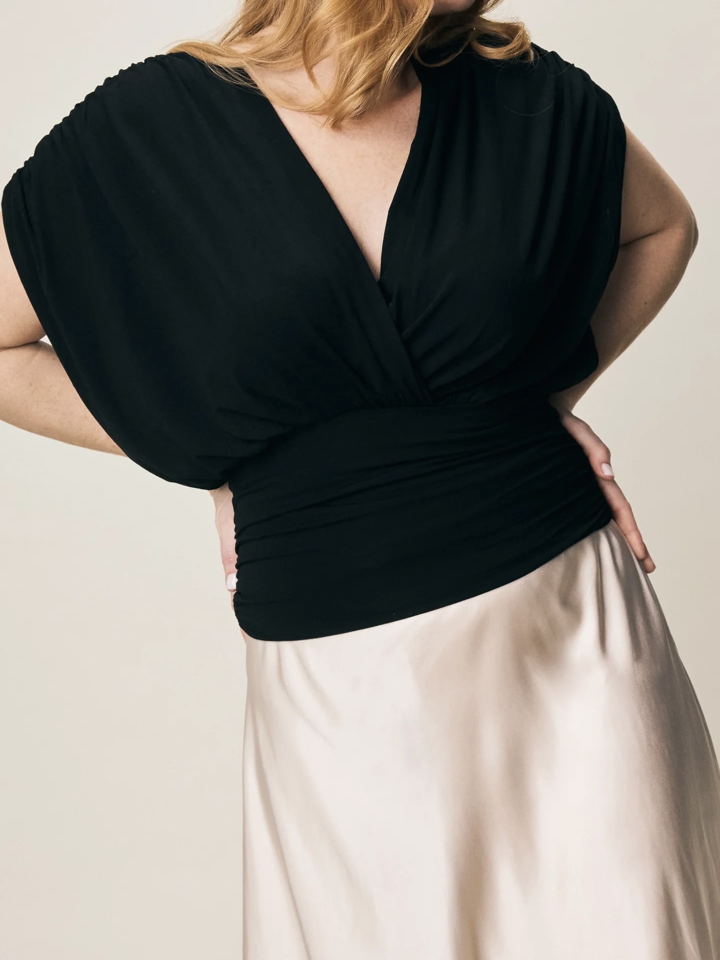 VIVEH Conus er laget med VIVEH-signaturstoffet, en ECOVERO™ viskosejersey som draperer vakkert og sitter tett rundt kroppen. Designet har en løs passform ved skuldrene og en tettsittende midje. Skuldersømmene draperes over skuldrene til en hettehylse. Conus-toppen er allsidig ettersom den kan brukes på to måter, med en moderne, elegant høy utringning eller en V-utringning for en mer klassisk, glamorøs look.