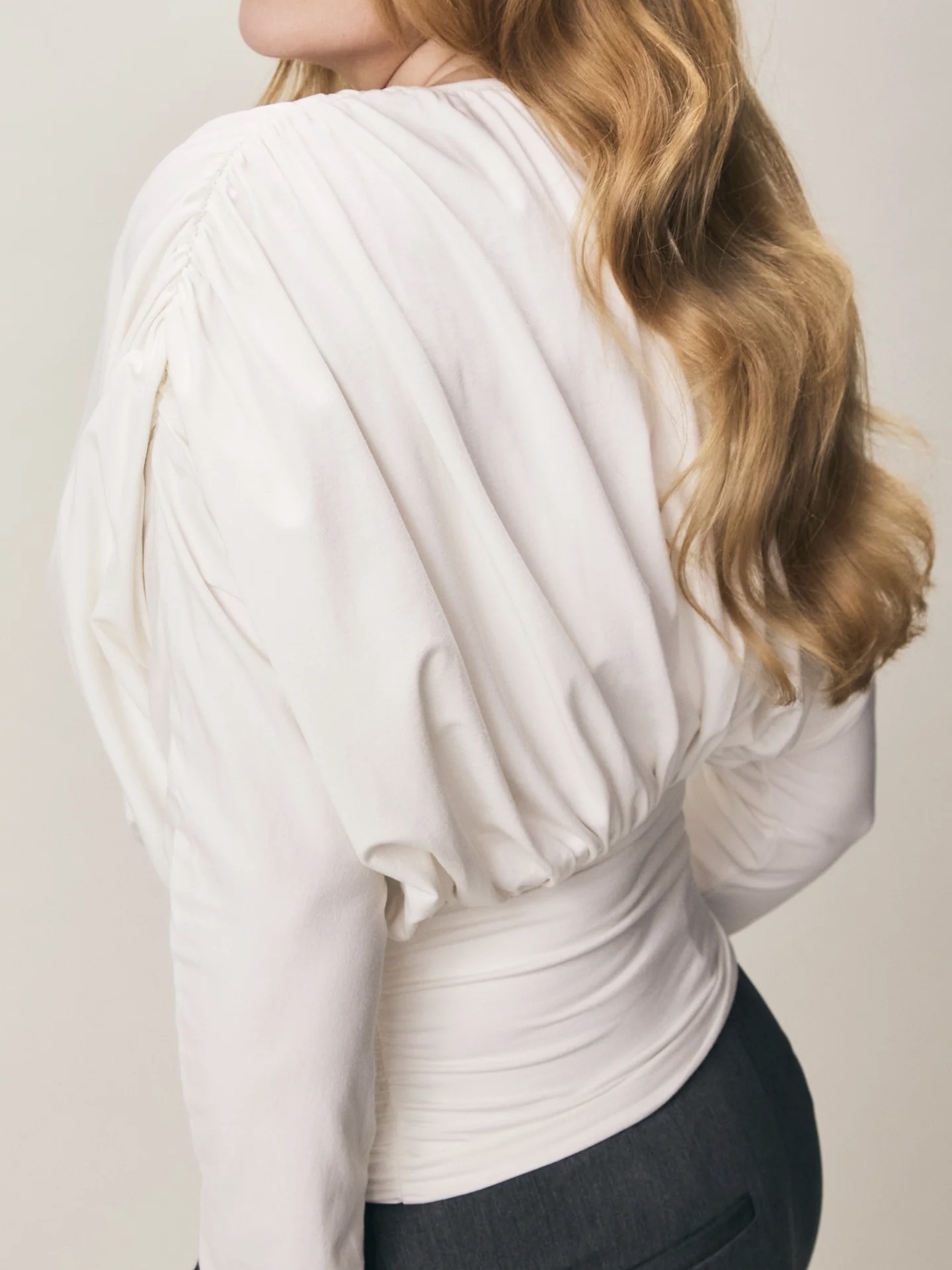 VIVEH Salvia-toppen er laget med VIVEH-signaturstoffet, en ECOVERO™ viskosejersey som drapererer vakkert og sitter tett rundt kroppen. Designet har lange ermer med løs passform på skuldrene og tettsittende midje. Salvia er allsidig ettersom den kan brukes på to måter, med en moderne, elegant høy utringning eller en V-hals for en mer klassisk, glamorøs look.
