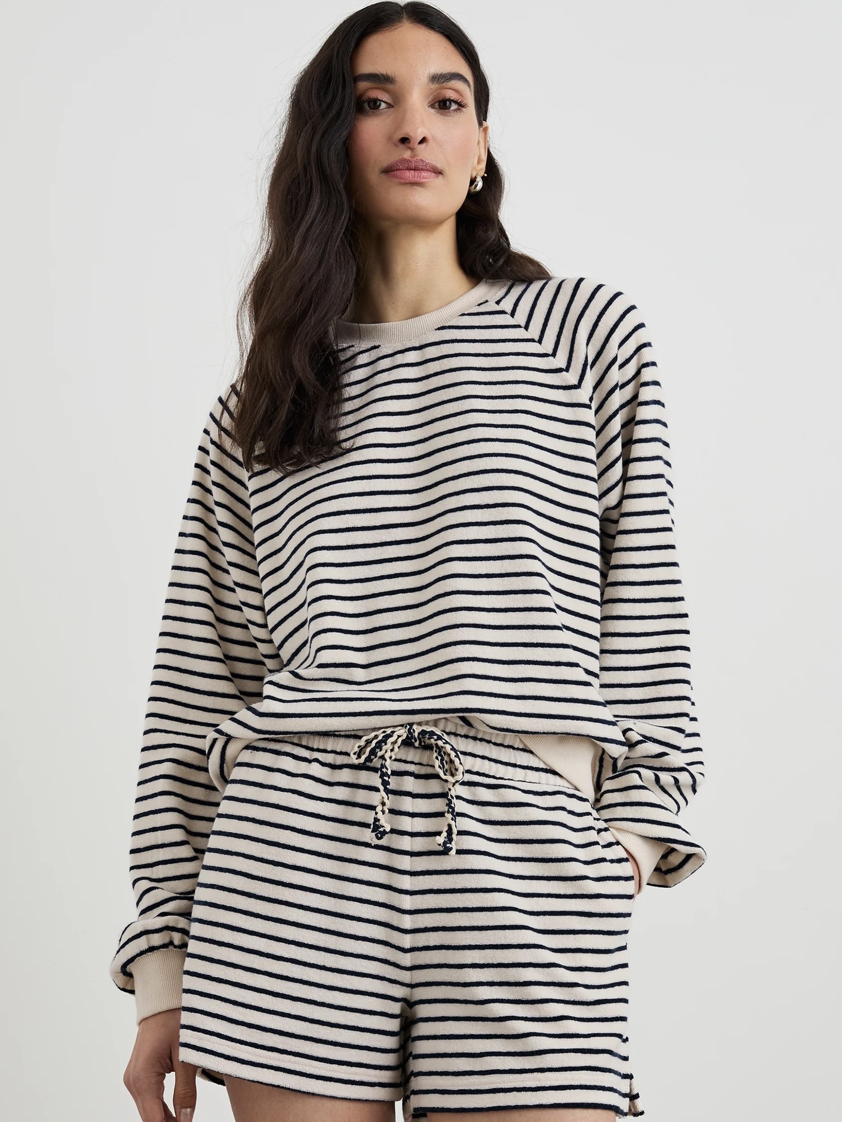 Theron, en supermyk frottégenser. Med kontraststrikkede mansjetter og fald med et nautisk-inspirert trykk, vil dette være din nye go-to for brunsj og sen kveldsbål.