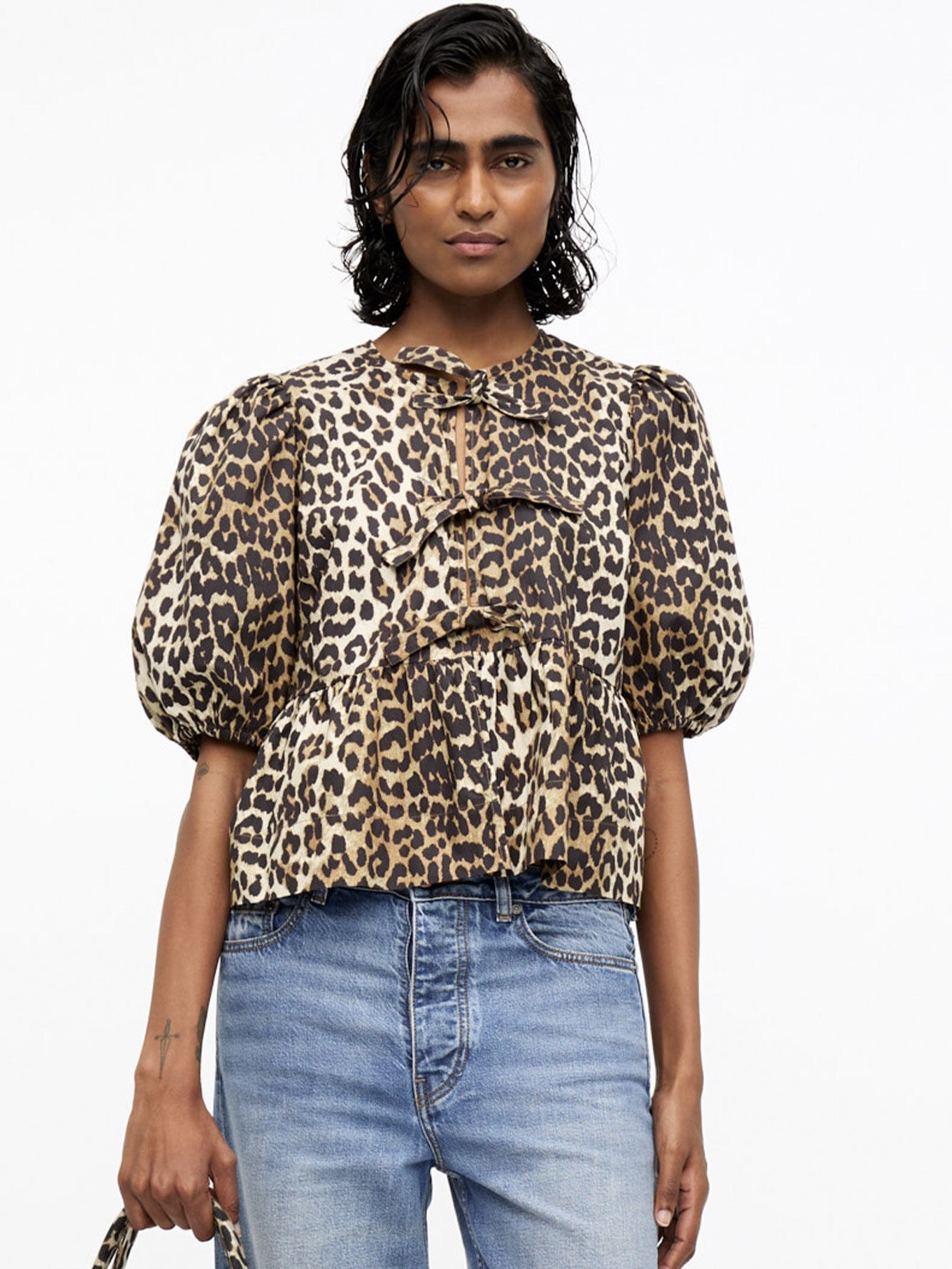 Leopard Cotton Poplin Peplum Tie-blusen har åpen, rund hals med knytebånd, puffermer med elastiske kanter og peplumfald.