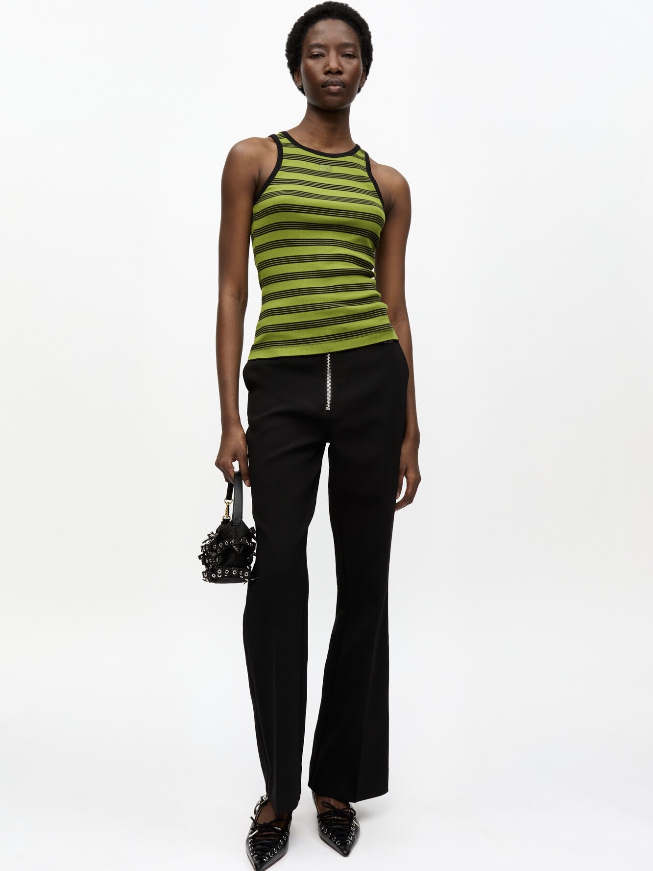 Disse svarte kreppbuksene er en allsidig garderobefavoritt designet for uanstrengt miks-og-match-styling. Disse buksene er laget av resirkulert polyester med en teksturert, kreppaktig finish, og har en normal passform med rette ben, en tung sølvfarget glidelåslukking, merkede trykknapper og en GANNI «Butterfly»-logodetalj.