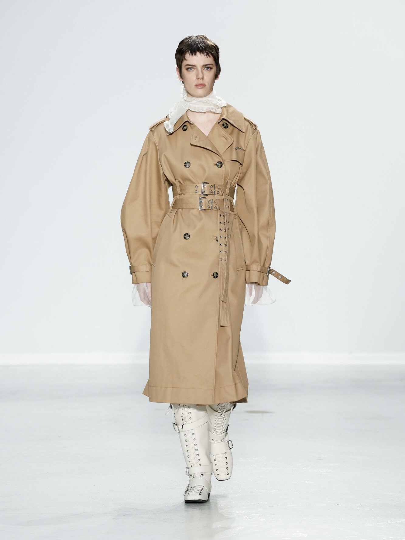 Denne svarte trenchcoaten i bomull har dobbeltspent knappelukking, buede ermer med justerbare mansjetter og en brodert GANNI-logo. Kåpen har to beltestropper i midjen, komplett med sølvfargede spenner.