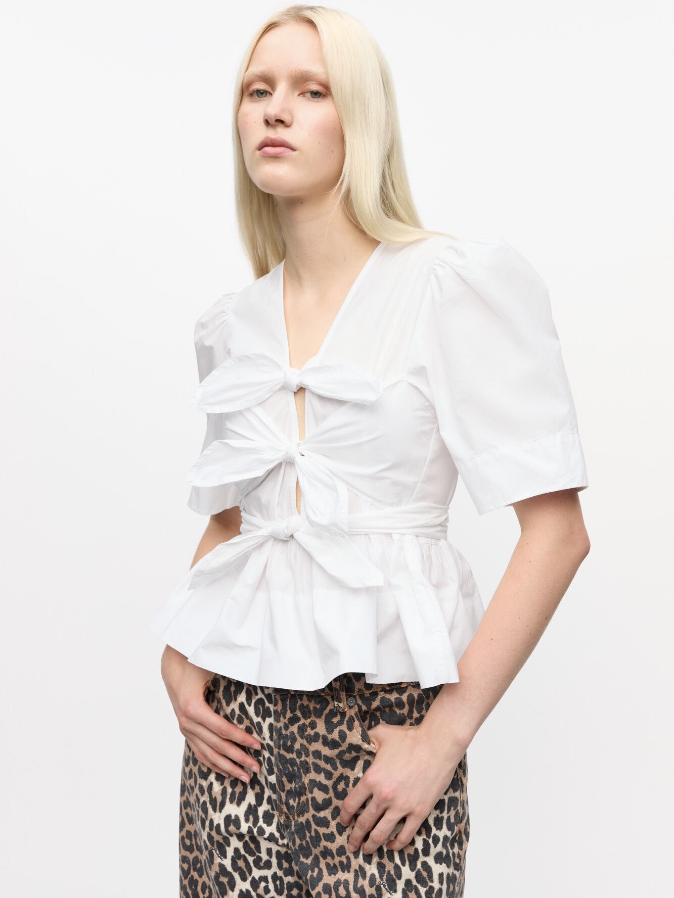 Denne elastiske blusen med knytestropper i hvitvasket bomull har en dyp V-hals, tre knytebånd foran og korte puffermer.