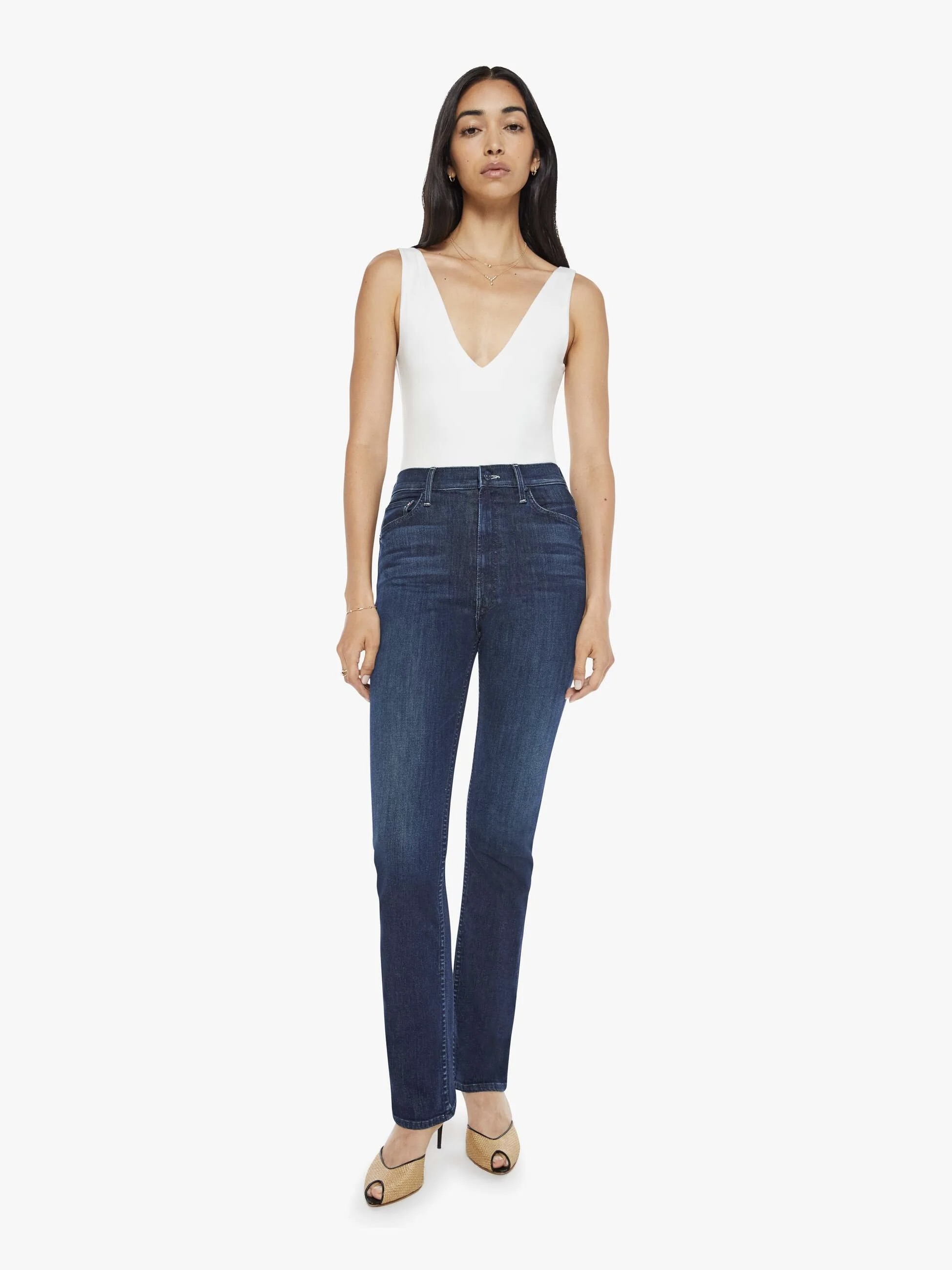 Jeans fra Mother med høye, rette ben og har en 31-tommers innersøm og en ren fald. Corner Piece er kuttet av stretchdenim og er mørkeblått med falming ved kneet.