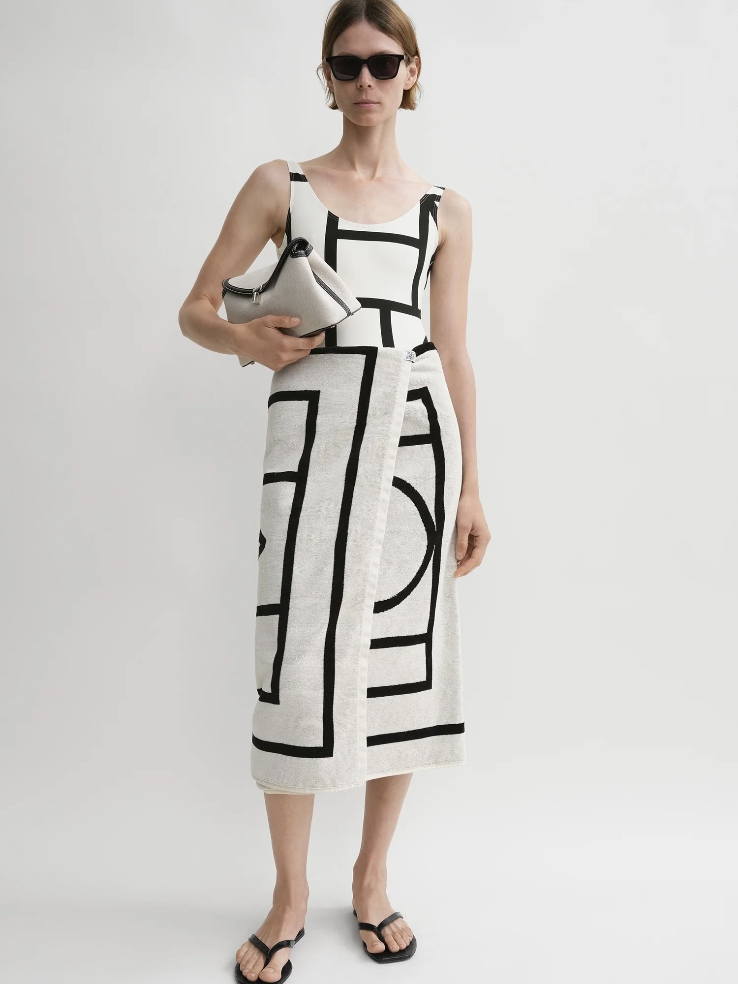 Dette klassiske strandhåndkleet har en gjentakelse av sand og elfenben av TOTEMEs signaturmonogram. Den er laget i Portugal av myk organisk bomullsvelour med en absorberende frotté bakside og måler 160x85 cm.