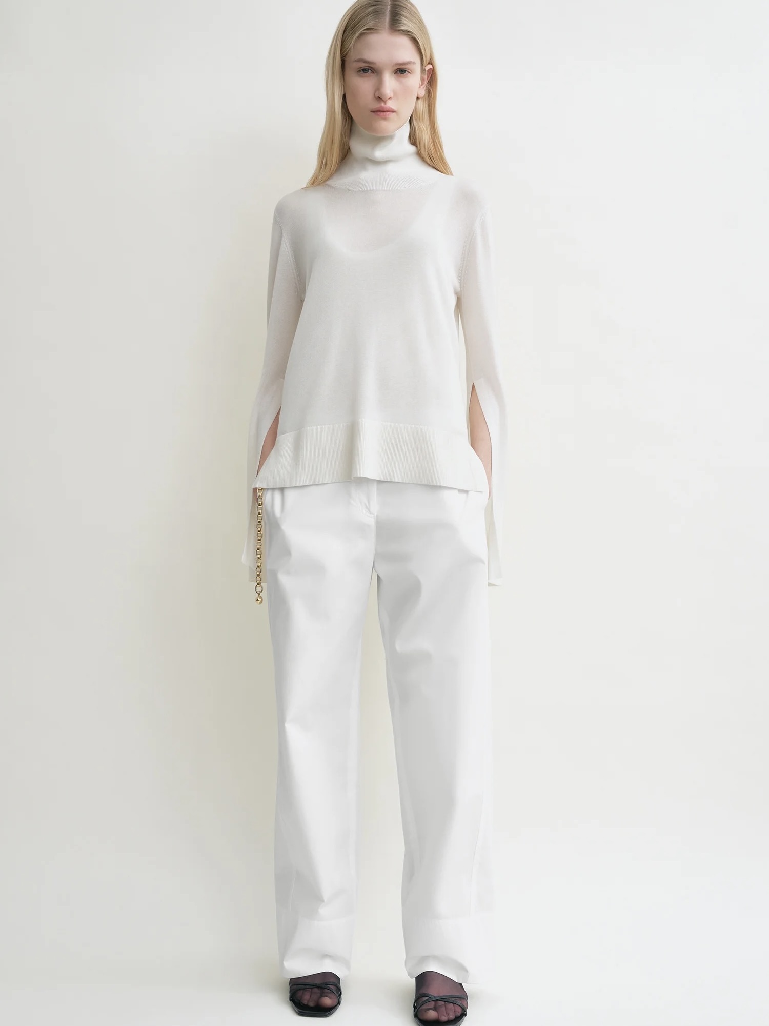 Disse TOTEME sommerbuksene, som vises på Summer 25-banen, bygger på våre symbolske vridde sidesømmer. De er laget av luftig organisk bomullspoplin med en bred, rett silhuett og har glidelåsgylf og praktiske side- og baklommer.