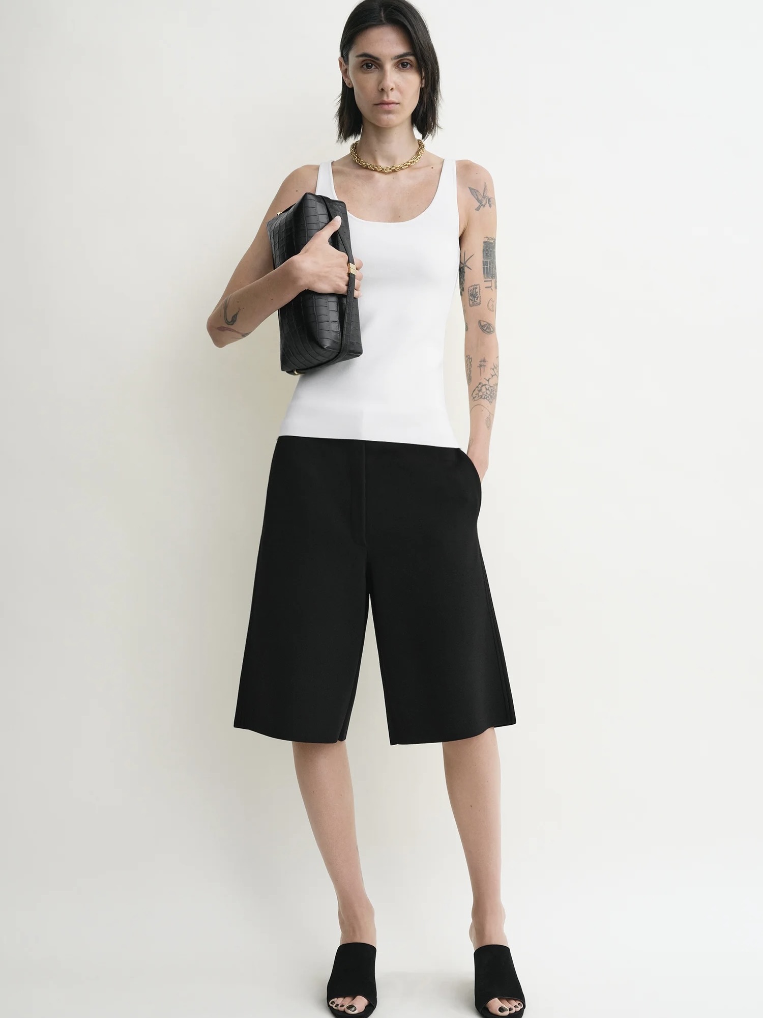 TOTEME-shortsene er gjennomsyret av en androgyn skandinavisk stemning. De er strikket i deres karakteristiske, kompakte jersey og har en avslappet, knelang silhuett som festes med kroker og skjult glidelås.
