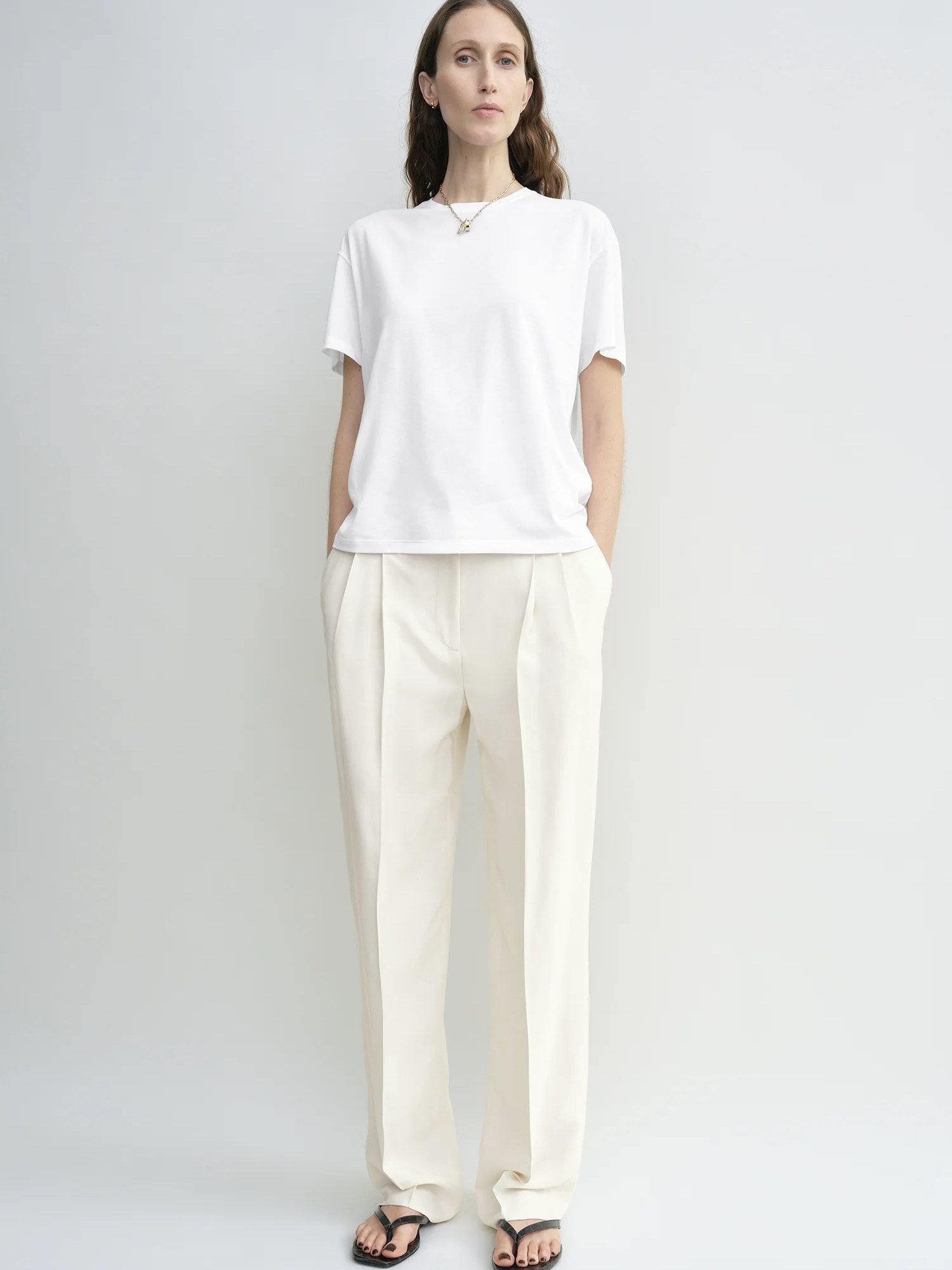 Designerens merknad: "TOTEME Garderob-t-skjorten har en avslappet silhuett og små proporsjoner. For å forsterke dens klassiske appell er den laget av lett jersey som er vasket for en myk, innlevd følelse, som omgir kroppen med en følelse av intimitet og fortrolighet. Vi liker å kombinere den med en fin kjede for å komplementere den enkle halsen."