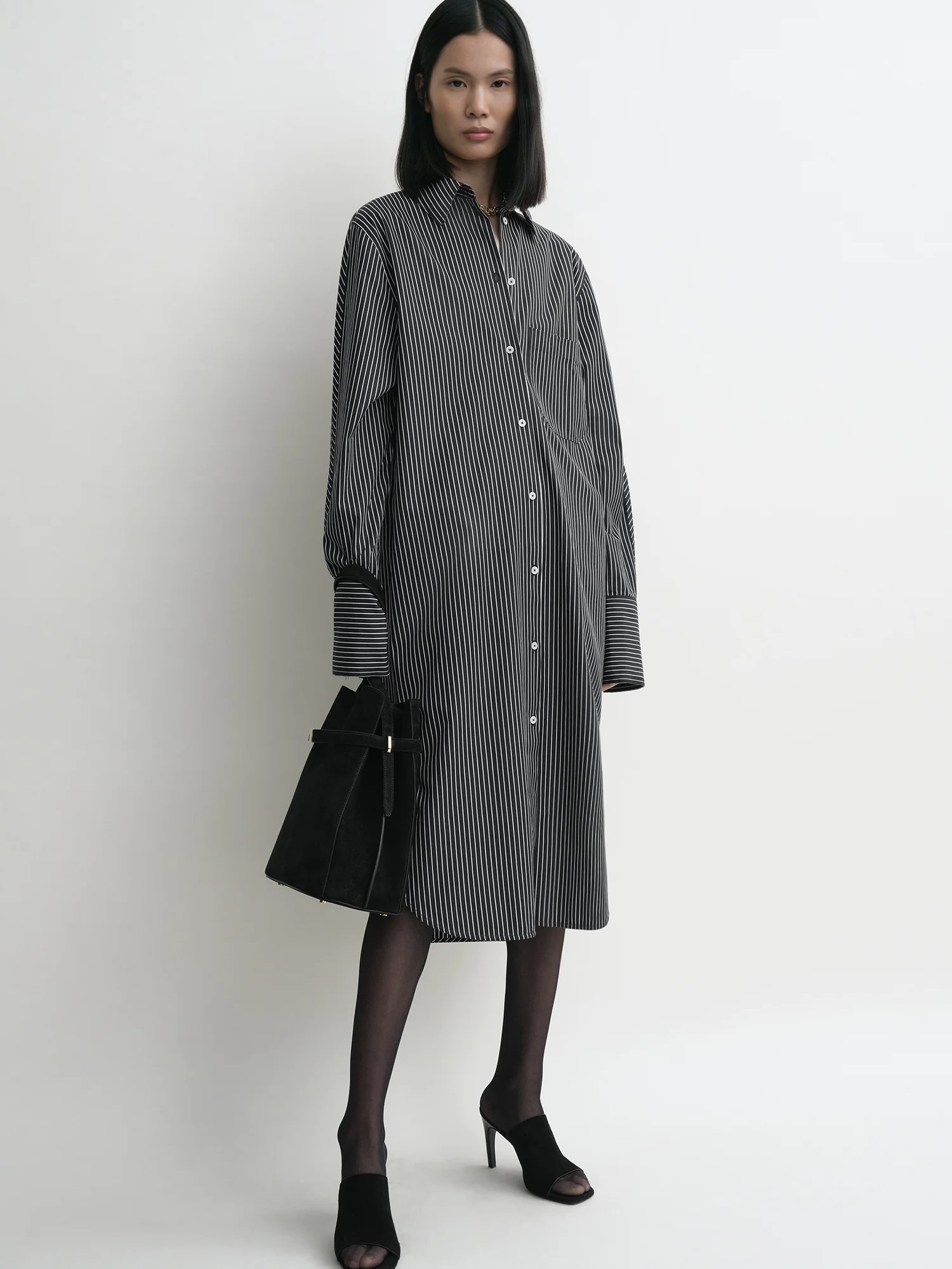 Svart og hvit-stripet TOTEME skjortekjole ferdig med rå kanter ved krage og mansjetter for å fange kolleksjonens håndverksstemning. Den er laget av bomull til en overdimensjonert silhuett med ermer i kimonostil, en brystlomme og en knappestolpe.