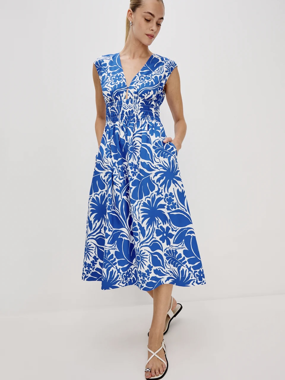 Roxanne er en midikjole i A-linje med en smocket midje og en delikat utskjæringsdetalj. Helfôret og laget i sprø bomullspoplin for en passform som er like deler komfortabel og flatterende.