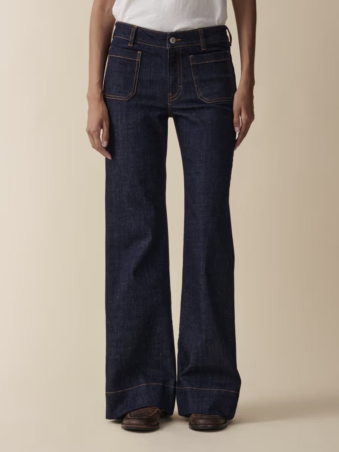 «St Monica Low» er en lav modell av vår ikoniske passform, som med sine påsydde lommer, sleng og brede falder henter inspirasjon fra sjømannsarkiver fra slutten av 1960-tallet.
