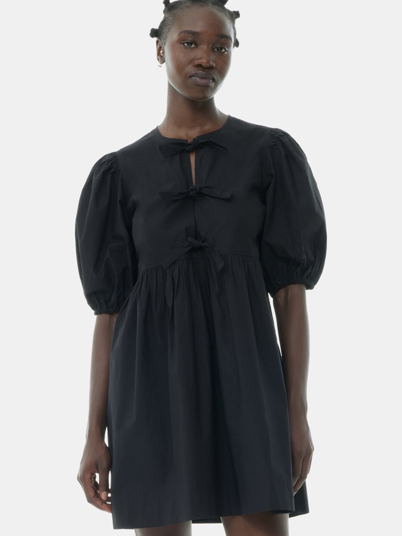 Black Cotton Poplin Tie String Mini-kjolen er designet for en avslappet passform og har åpen, rund hals med knytelukking og signatur-puffermer med elastiske kanter.