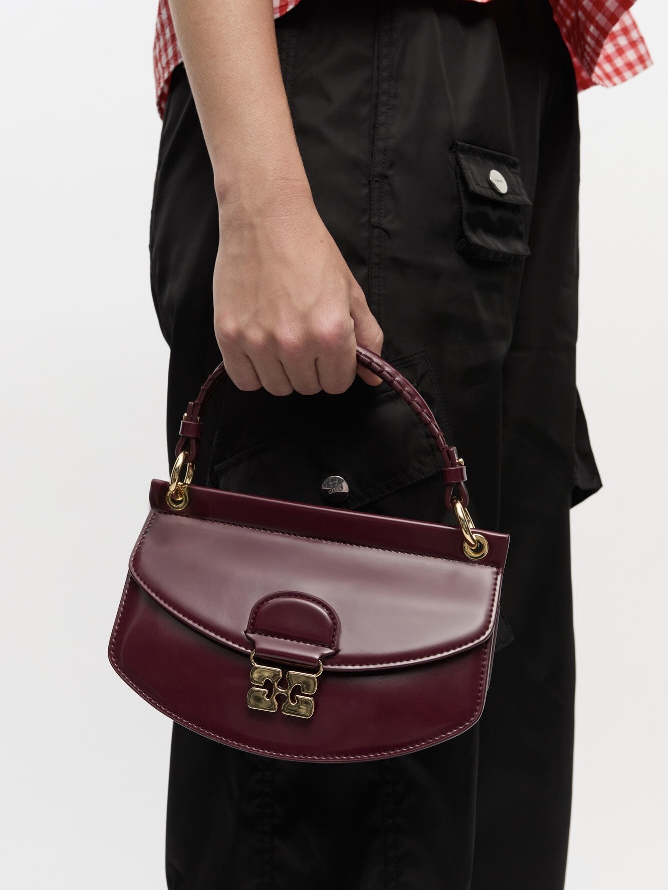 Denne vesken har en strukturert silhuett, et topphåndtak og en justerbar og avtakbar skulderrem. Vesken har magnetisk lukking med en gullfarget GANNI «Butterfly»-spenne, stikklomme og tre hovedrom.