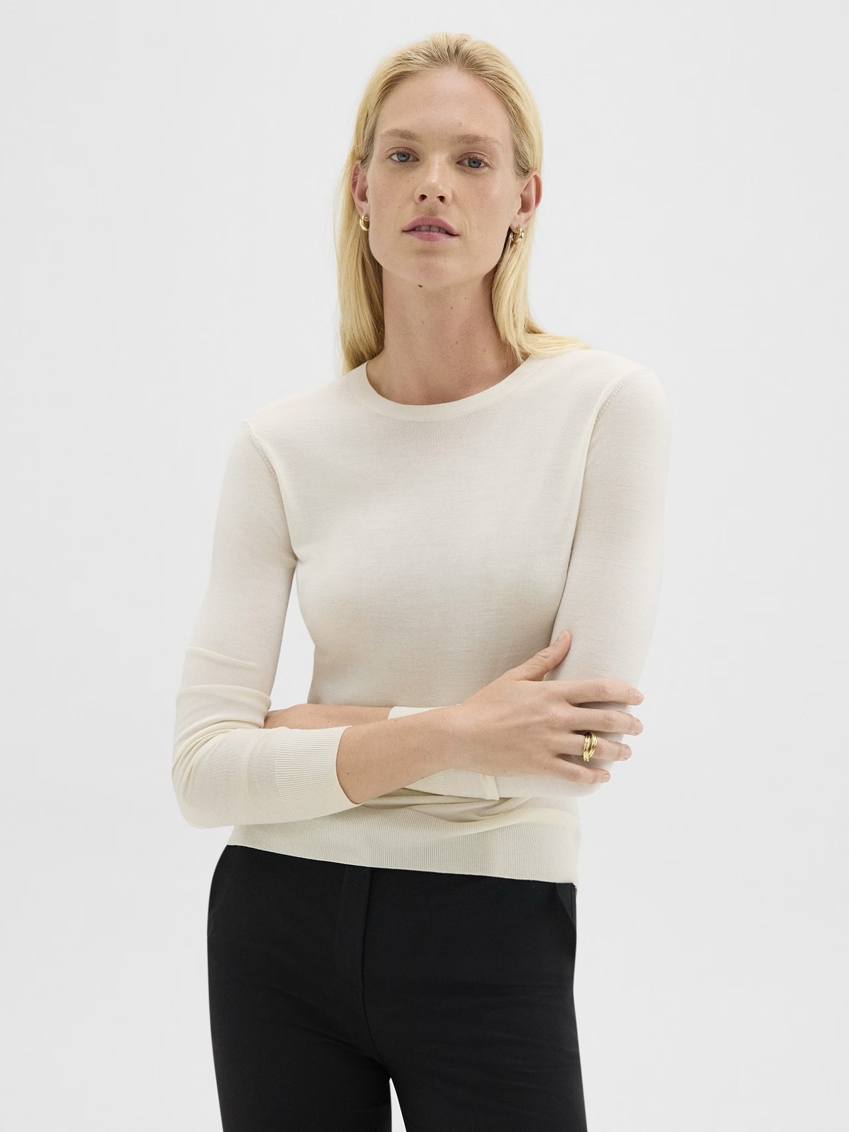 Denne langermede genseren med rund hals har detaljer med delikate ribbekanter i halsen, falden og mansjettene. Den er strikket i Italia av fin merinoull og er tilgjengelig året rundt, og er designet for å være et basisplagg i garderoben din.