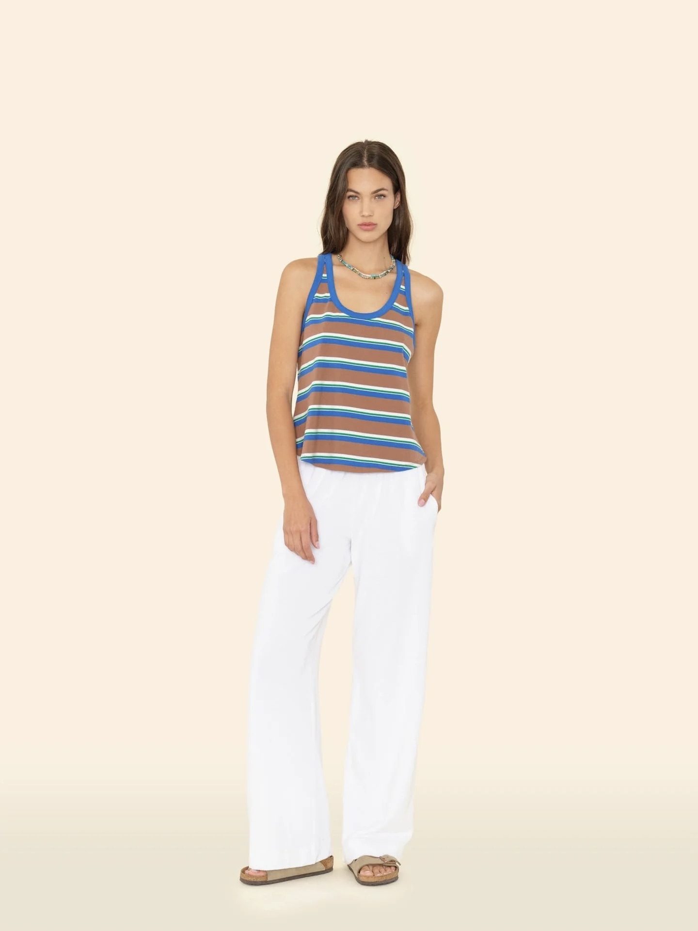 Nyt solen. Delany er laget i Xirena sin nye bomullsblanding med håndklefrotté. Delany er en joggebukse med vide ben, elastisk midje og lommer i sidesømmene.