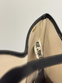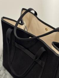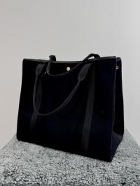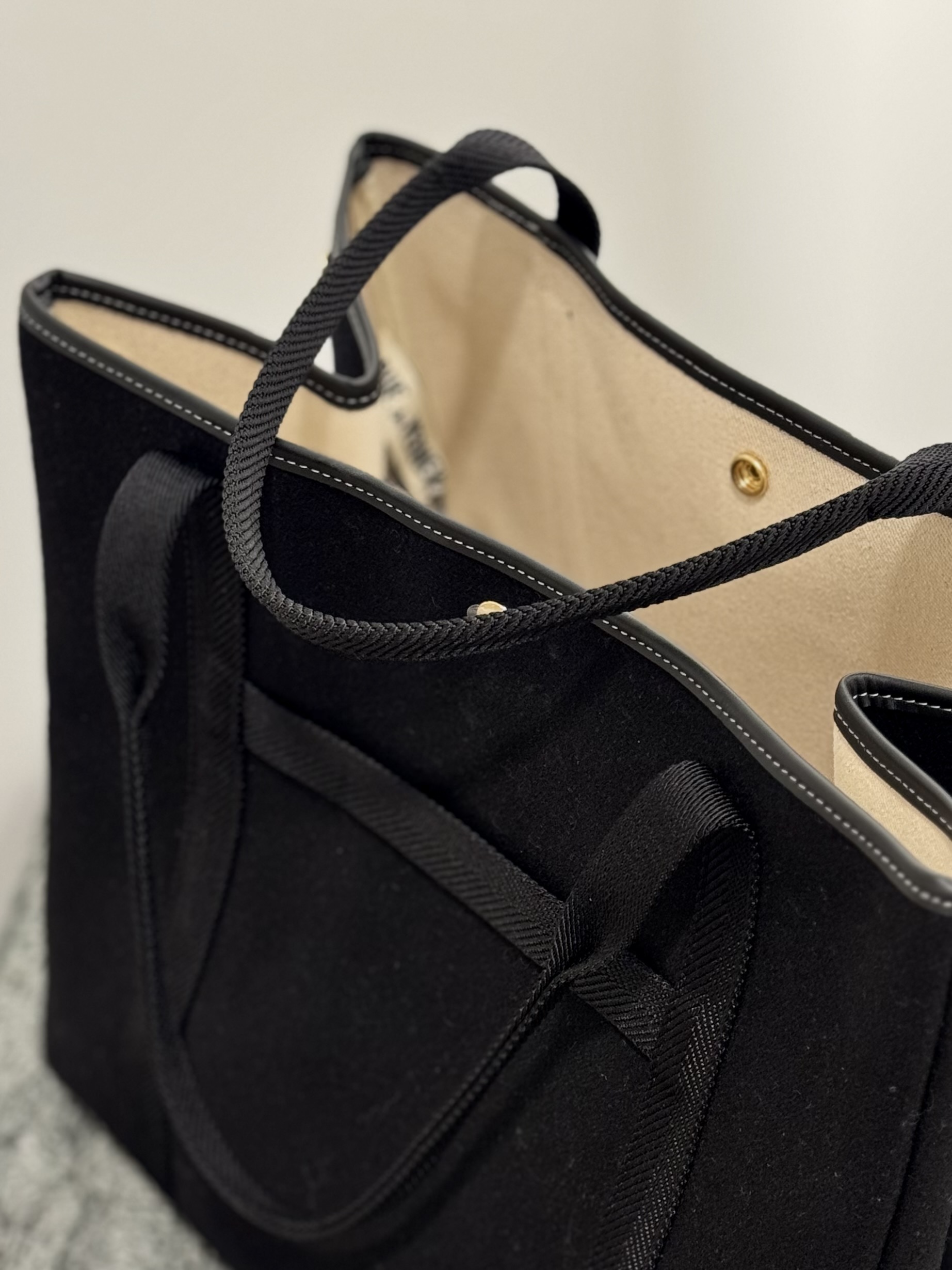 Traversée L Whip-veske, laget av svart flanellstoff, er en flott reiseveske. Navnet refererer til hesteverdenen. Den har svarte håndtak og en horisontal brun stropp som kan skyves over håndtaket på kofferten din for å feste den.