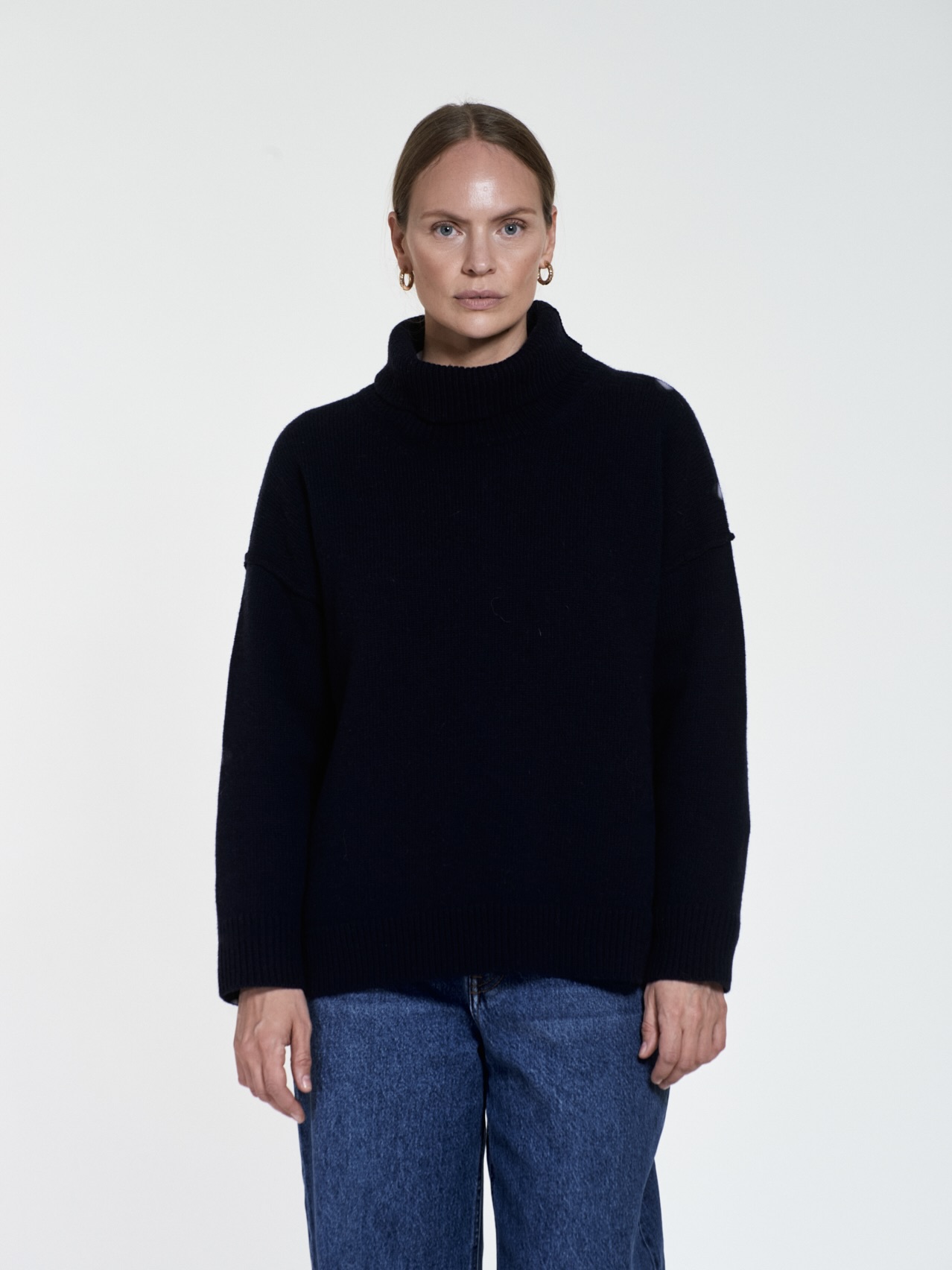 Chunky strikkegenser laget i en kompakt og myk ullblanding. Modellen er designet med høy hals, vrangsømmer, nedfalne skuldre, ribbestrikket hem, mansjett og hals. Rett til romslig i fasongen med noe smalere ermer.